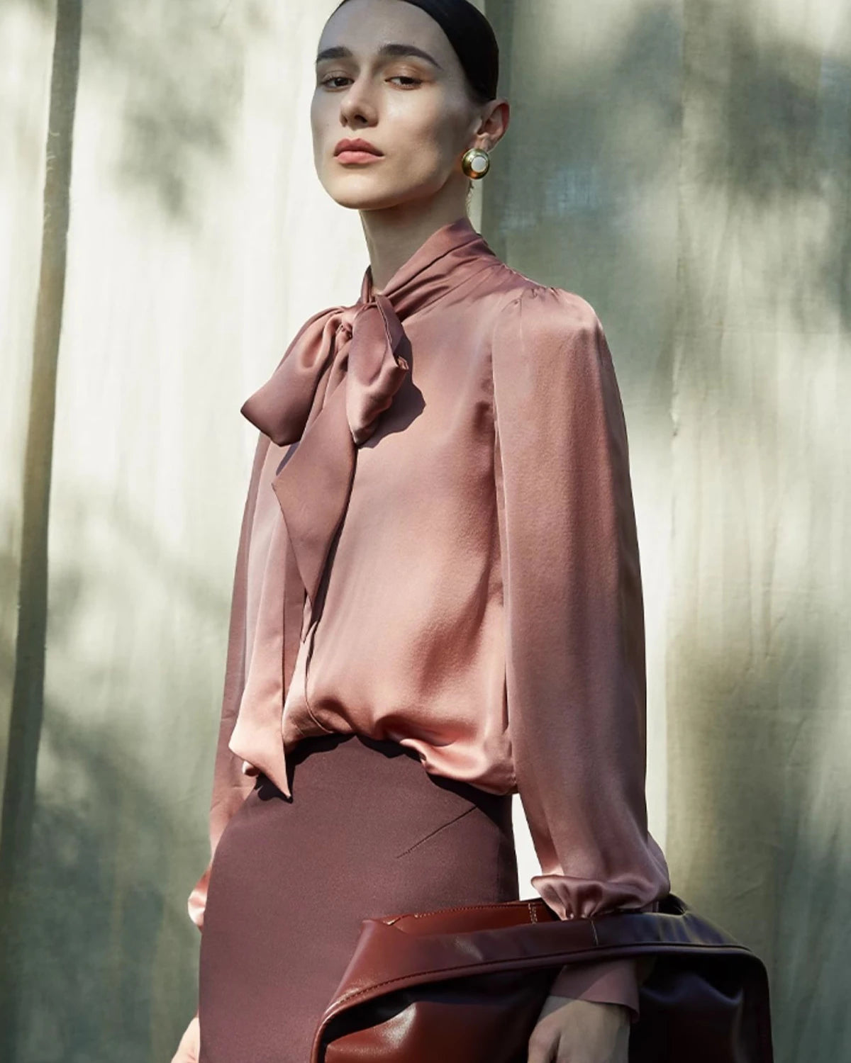 This tie-front silk blouse features an elegant bow tie neckline, long sleeves, and a fluid silhouette.