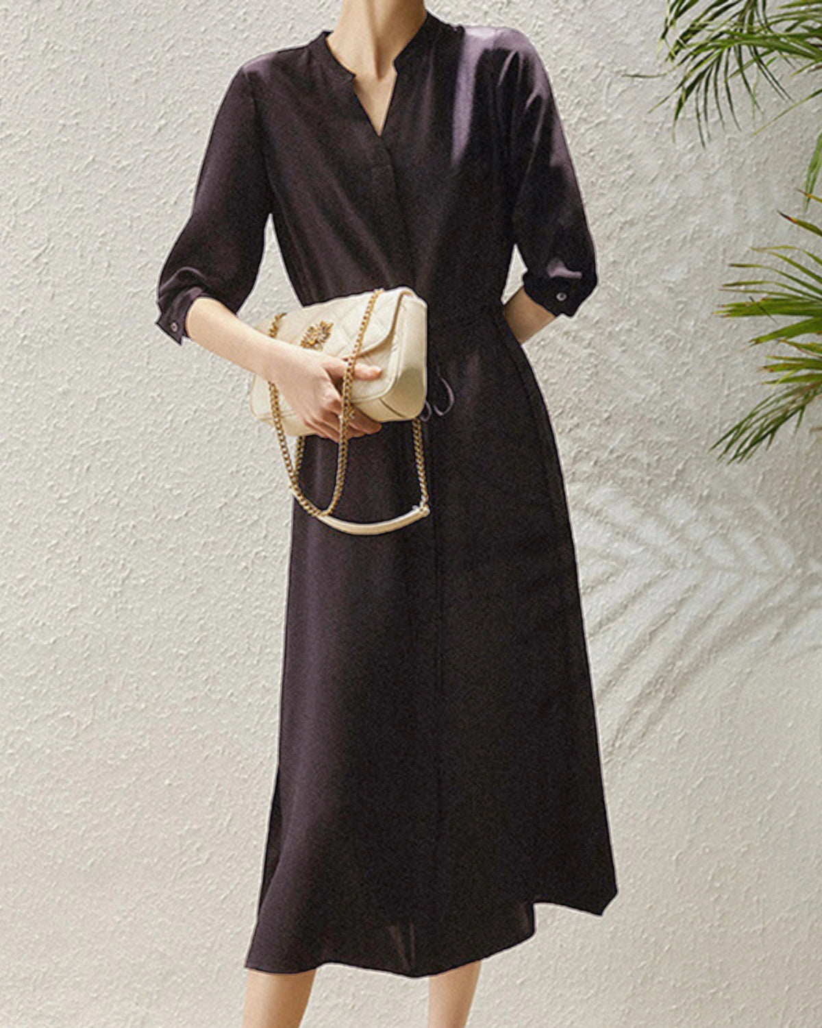 This silk shirt dress features a refined slit neck, an adjustable drawstring waist, and graceful 3 4 sleeves. The midi length and shirt-inspired tailoring create a timeless silhouette that flatters every body type. Available in soft neutral tones, it’s a versatile silk dress with sleeves that blends comfort and sophistication.