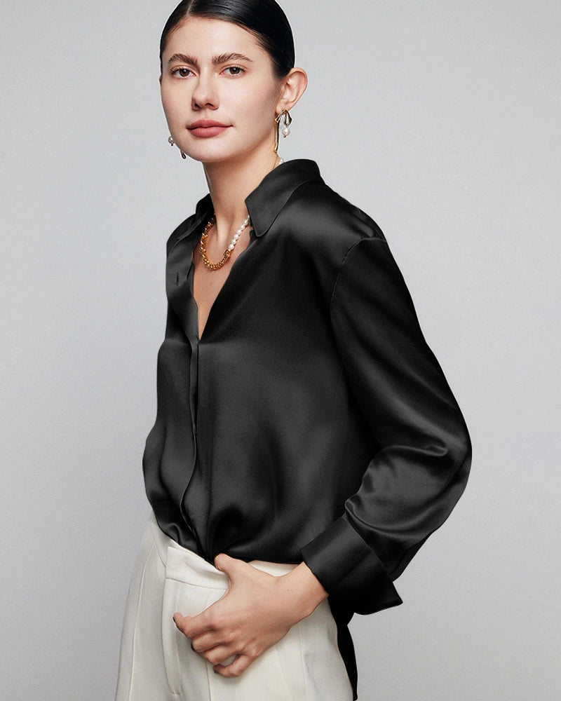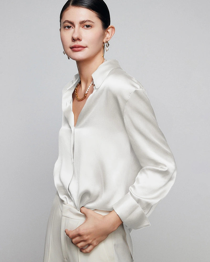 Breathable, hypoallergenic, and naturally temperature-regulating, this silk long sleeve shirt provides pure comfort and elegance all day long. Perfect as silk blouses for work or formal silk tops for ladies, it blends luxury with practicality. The white silk shirt women edition adds crisp sophistication, while darker tones like black silk button down bring sleek versatility. Also available as a plus size silk blouse, ensuring every woman experiences the indulgence of premium 30 momme silk.