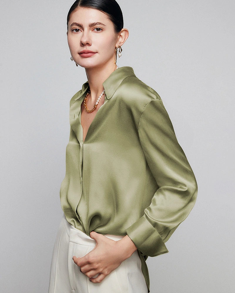 Crafted from 30 momme silk crepe de chine, this silk blouse offers exceptional luxury and durability beyond standard silk shirts. The heavier 30 momme weight gives it a rich drape, fluid movement, and natural sheen that feels indulgent yet resilient. This silk shirt women style resists wrinkles, provides better opacity, and keeps its shape beautifully over time. The smooth texture of this silk top feels cool and soft against the skin, ideal for both warm and cooler seasons.