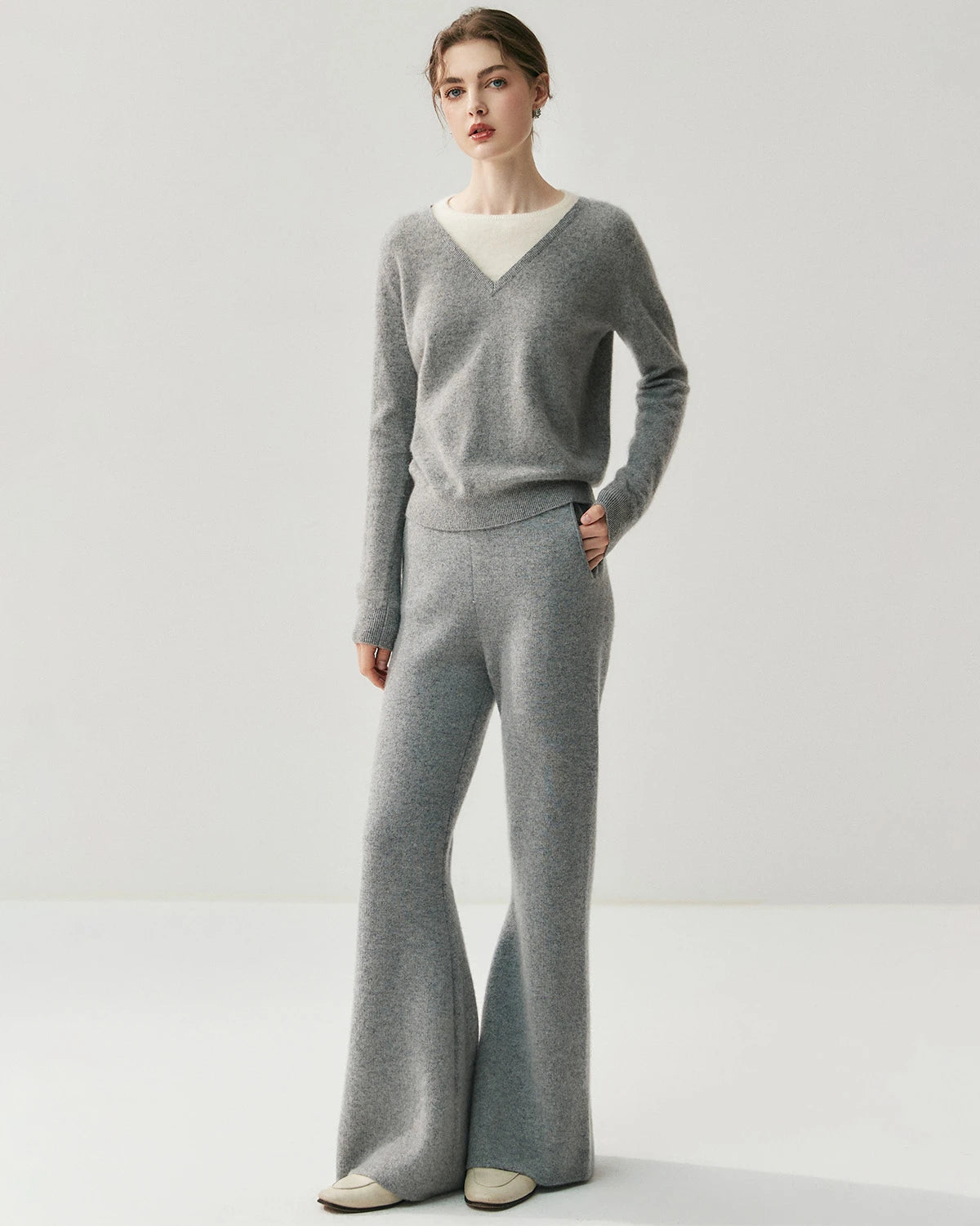 These women’s cashmere trousers feature a flattering slim fit with a subtle flared hem, designed to elongate the legs and enhance the body’s natural lines. Side pockets add practicality, while the soft knit waistband ensures comfort without compromising style. Combining tailored elegance with cozy knit texture, these pants perfectly balance structure and ease.