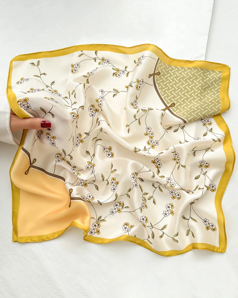 This square silk scarf features a delicate small floral pattern in soft beige, bright yellow, and pale green, creating a light, elegant look.