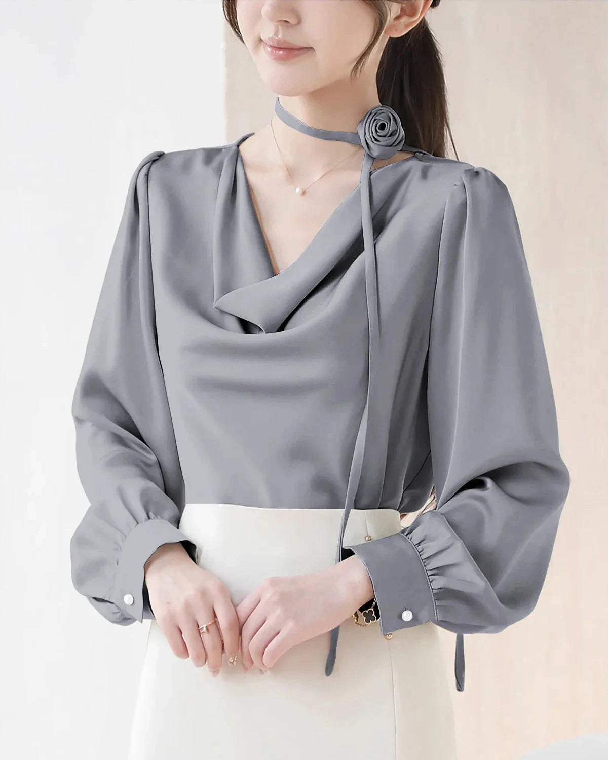 Featuring an elegant draped collar and romantic puff sleeves, this long sleeve silk blouse elevates your wardrobe with timeless sophistication. The delicate rosette necklace detail adds a feminine touch, making it ideal for ladies silk blouses in white, black, pink, or green for versatile styling.