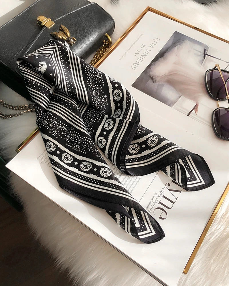 This square silk scarf presents a striking black and white print with paisley patterns, horse motifs, and belt-inspired details. The design combines equestrian elegance with timeless paisley style. Its versatile size allows styling as a ladies head scarf, silk scarf head wrap, or a sophisticated silk shawl.