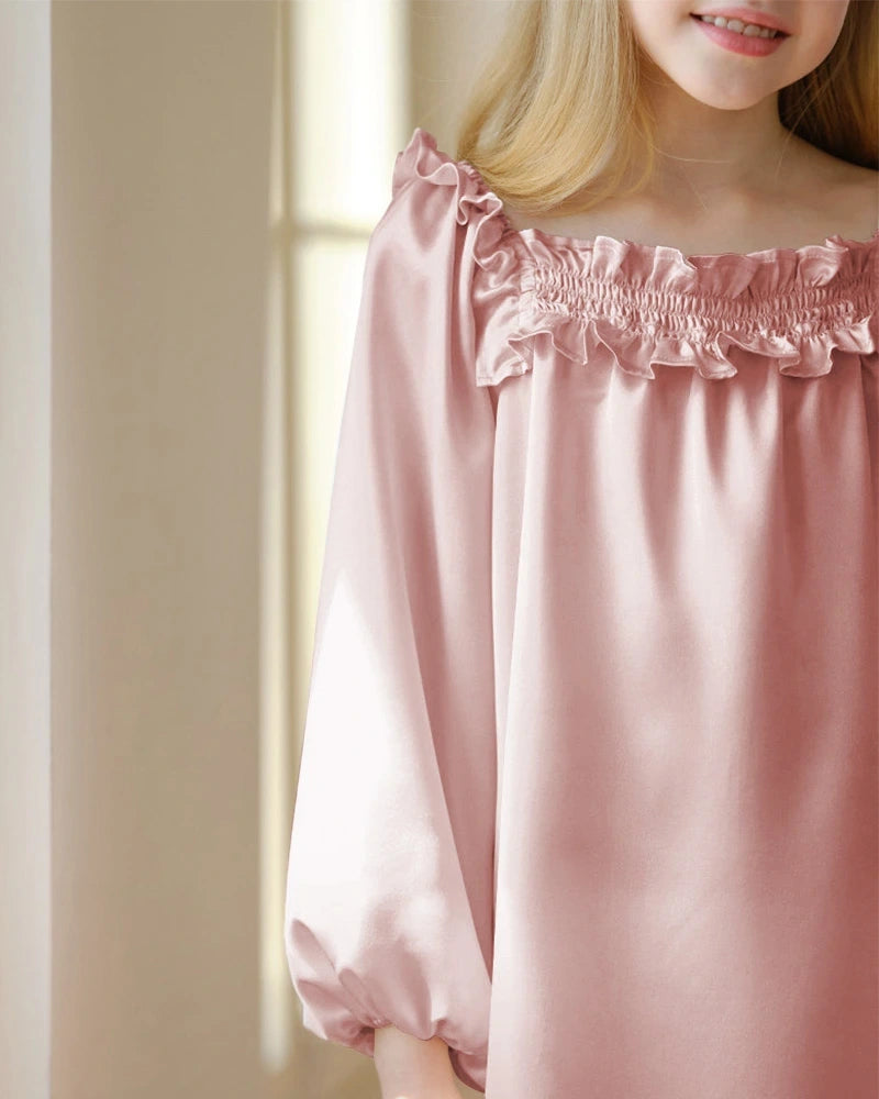 As a premium piece of girls sleepwear, this silk nightgown is naturally breathable, moisture-friendly, and gentle on sensitive skin. Silk helps reduce irritation and supports a comfortable sleep environment, making it a thoughtful option for parents looking for high-quality kids silk pajamas and sleep dresses.