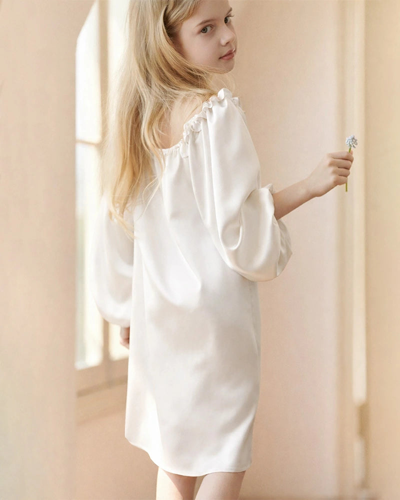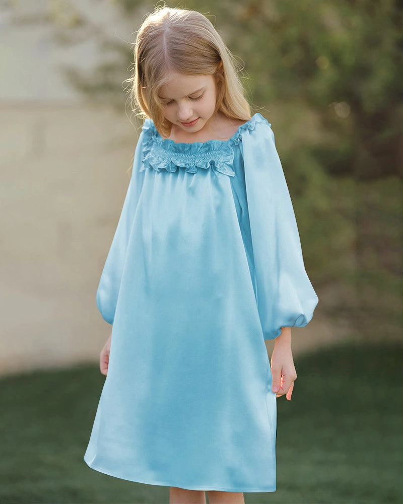 Featuring a long sleeve silhouette, this silk sleep dress offers added coverage while maintaining a relaxed, easy fit. The softly gathered ruffled neckline adds a refined, timeless detail that elevates the look beyond traditional pajamas, allowing the piece to function as both a silk nightgown and a casual silk dress for children.