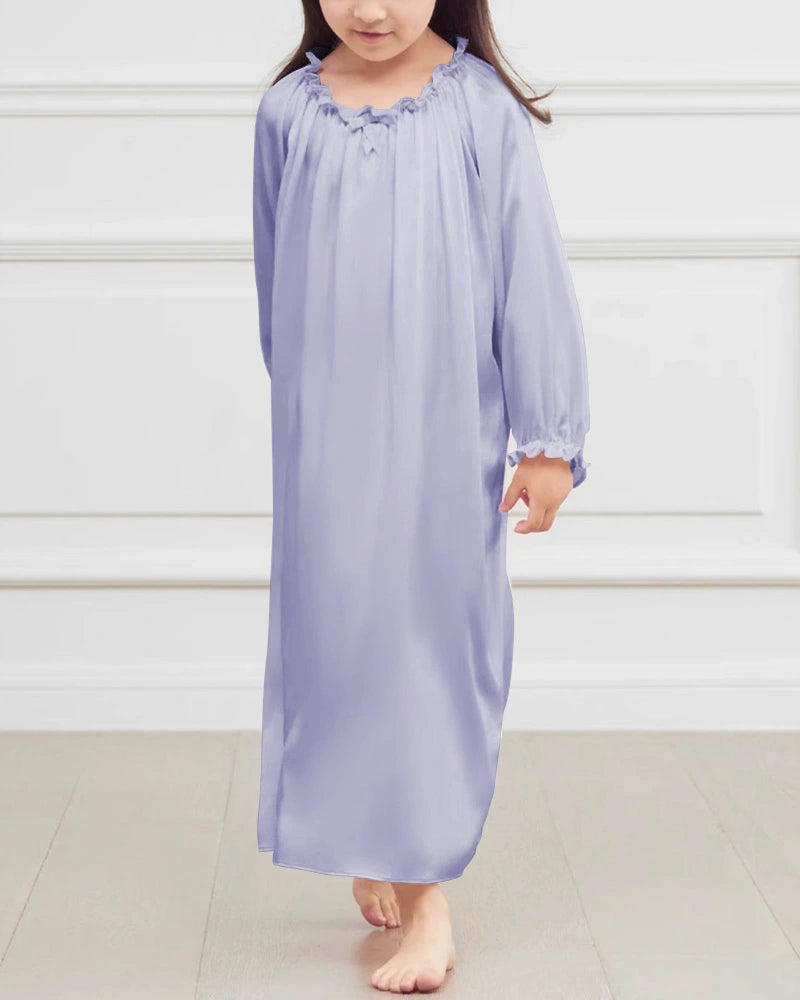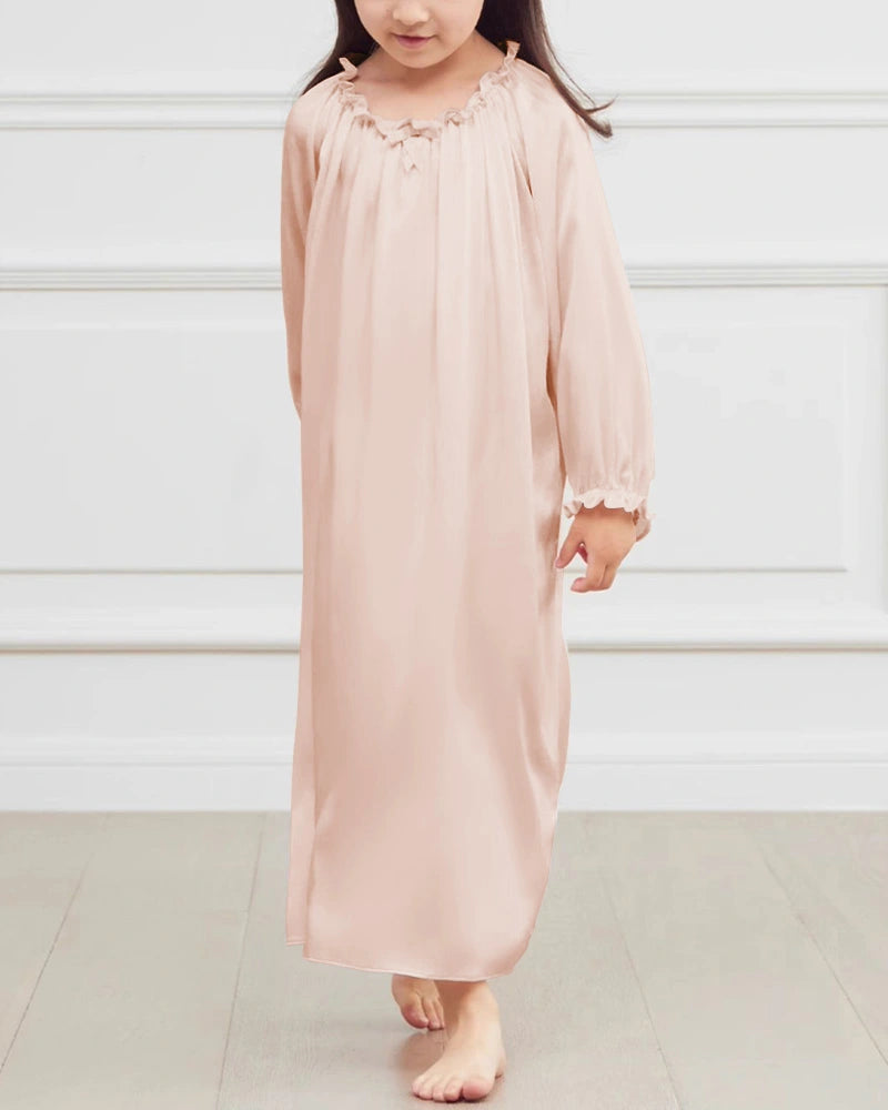 Mulberry silk is known for its naturally breathable and skin-friendly qualities, making this girls silk nightgown especially suitable for children with sensitive or easily irritated skin. The long sleeves offer gentle coverage, while the lightweight drape keeps the nightgown comfortable for sleeping, reading, or lounging indoors.