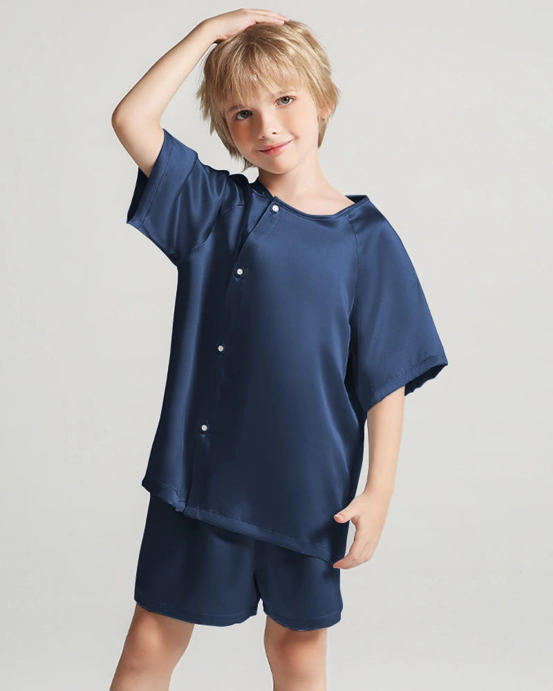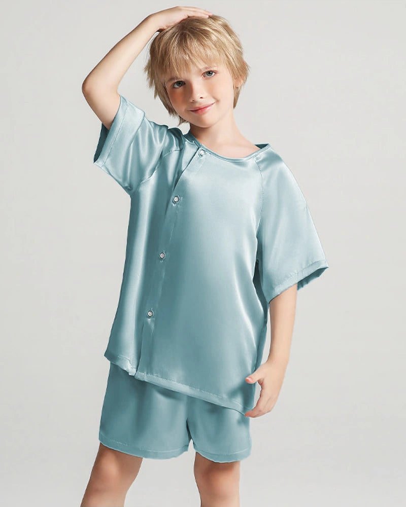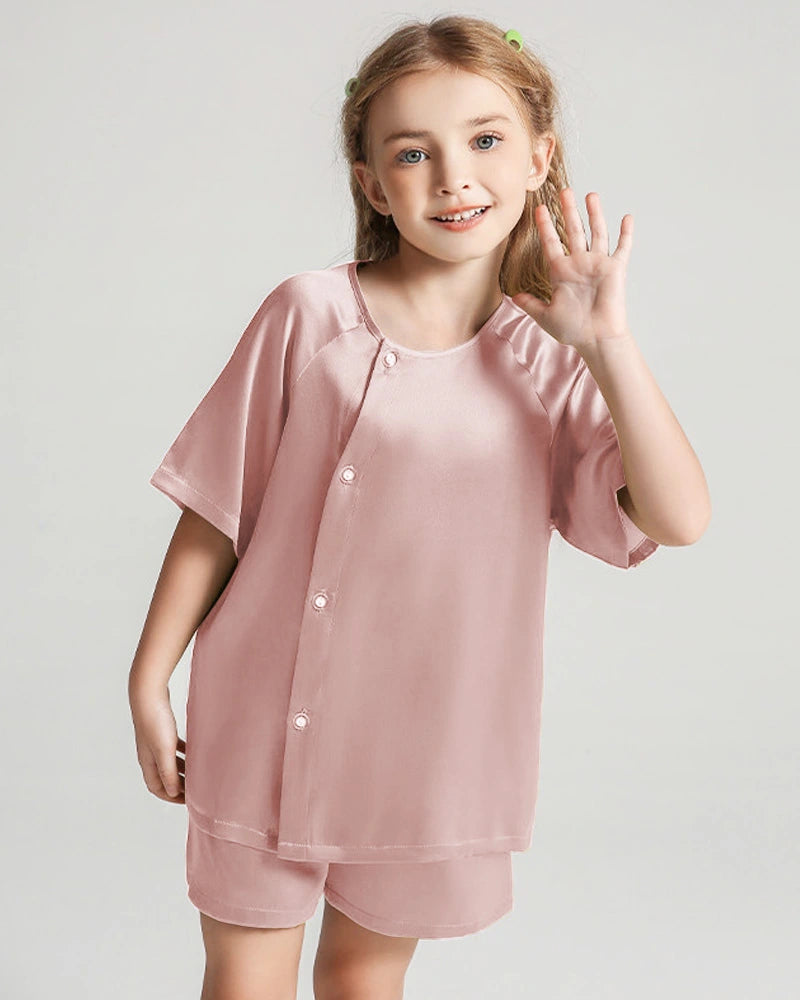 The DaisySilk Kids Silk Pajama Set features a short sleeve silk button-front top with a subtle side placket design, paired with matching silk shorts. Crafted from 100% OEKO-TEX certified mulberry silk, this set is specially designed for babies and children with sensitive, delicate, or eczema-prone skin.