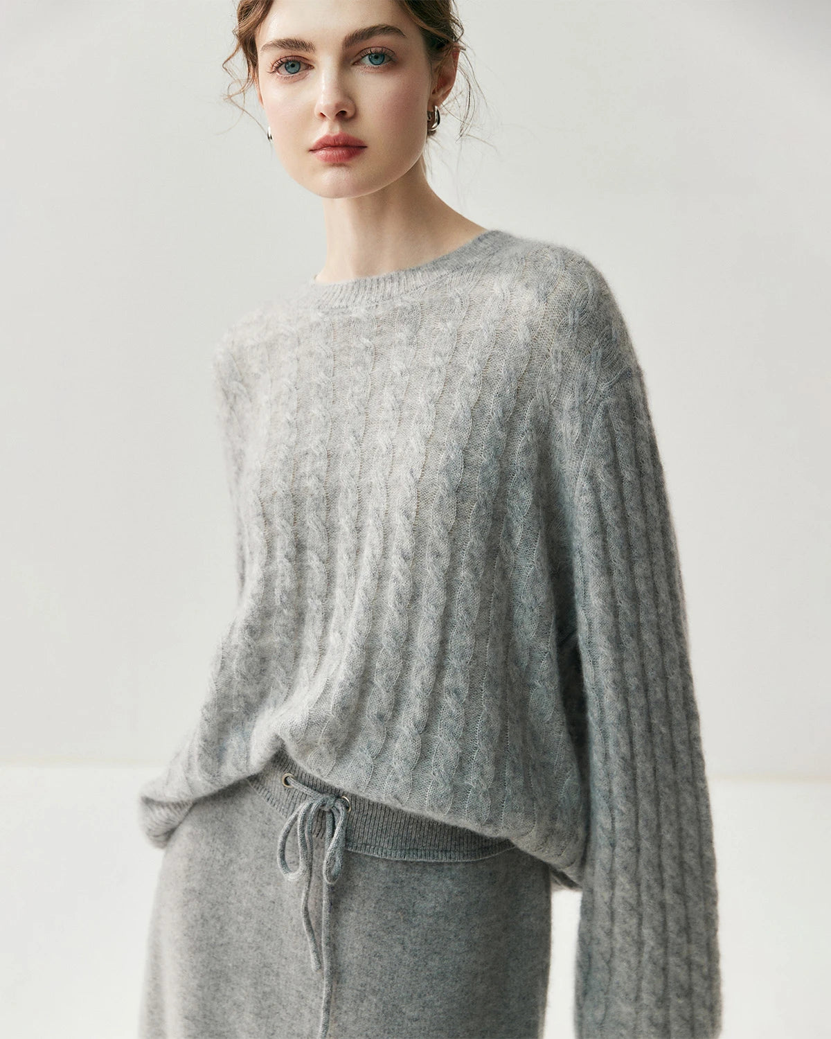 This crew neck pullover showcases delicate small cable knit details, creating a refined yet relaxed silhouette. Its oversized cut enhances comfort, making it a versatile piece in cashmere pullover women designs, women's cashmere jumper collections, and cool cashmere sweaters for modern wardrobes.