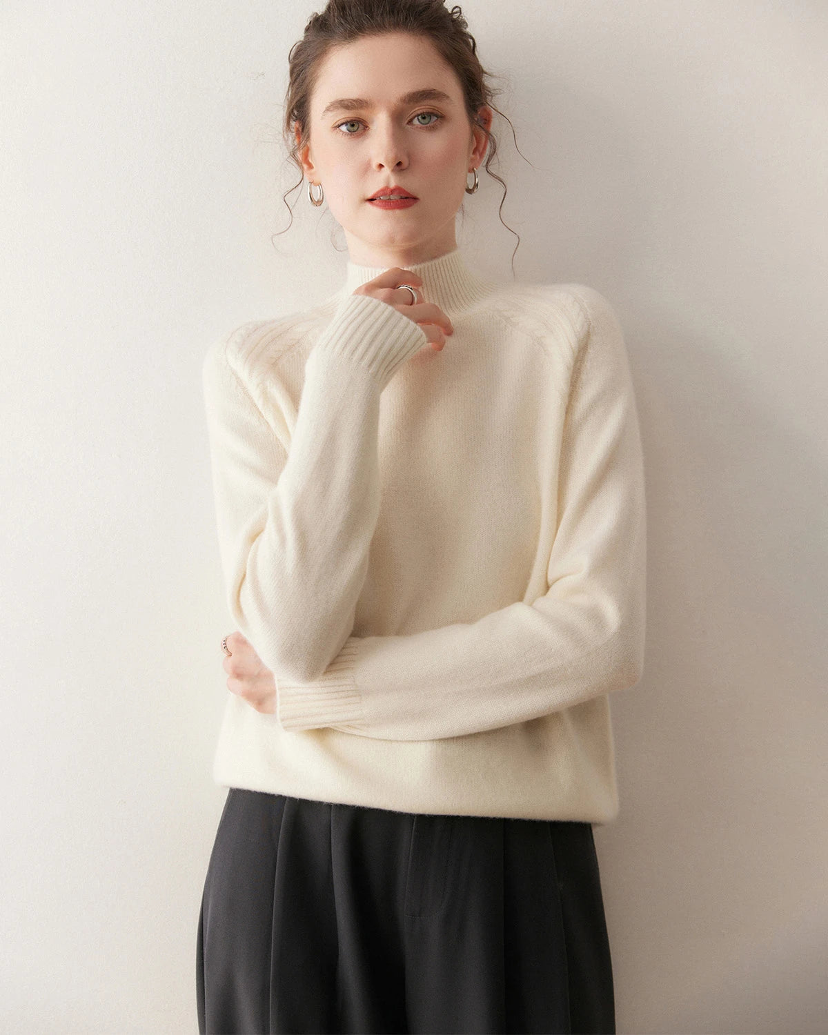 This mock neck cashmere pullover features refined raglan sleeves and elegant cable knit detailing along the shoulder lines, adding a hint of sophistication to a minimalist silhouette. Its clean neckline and sculpted shape offer a polished yet relaxed appearance that complements women’s cashmere sweaters and cashmere jumpers alike.