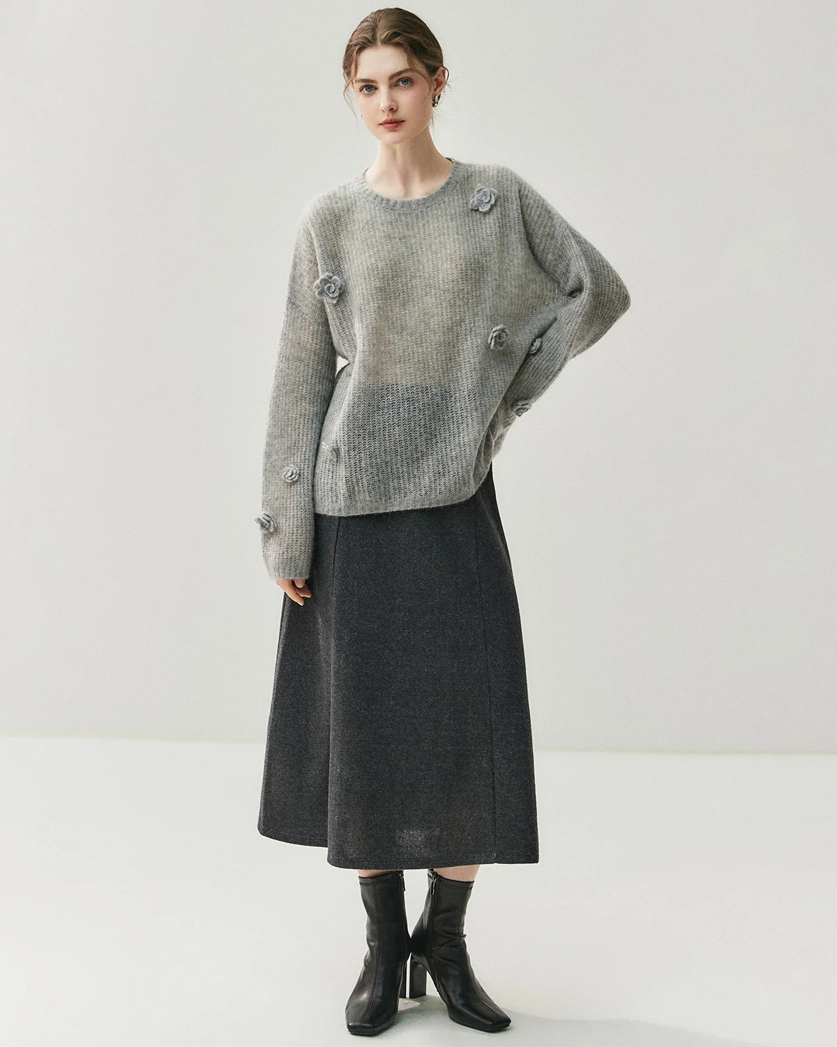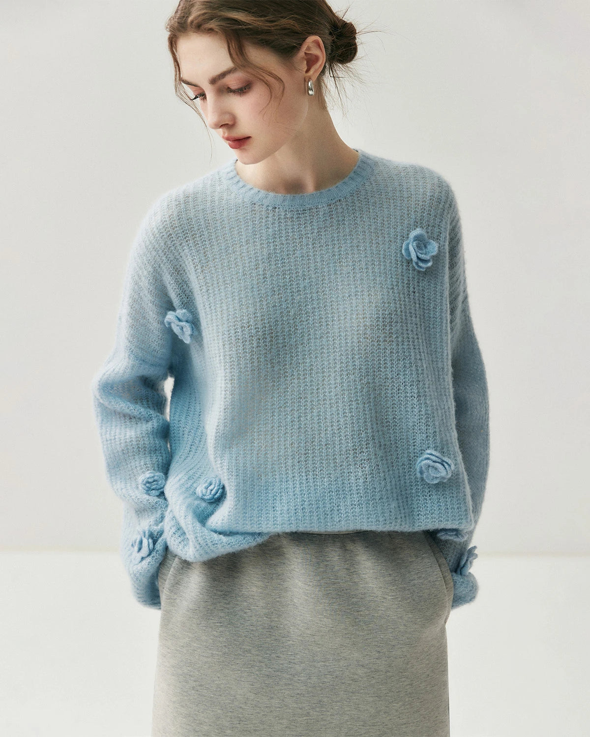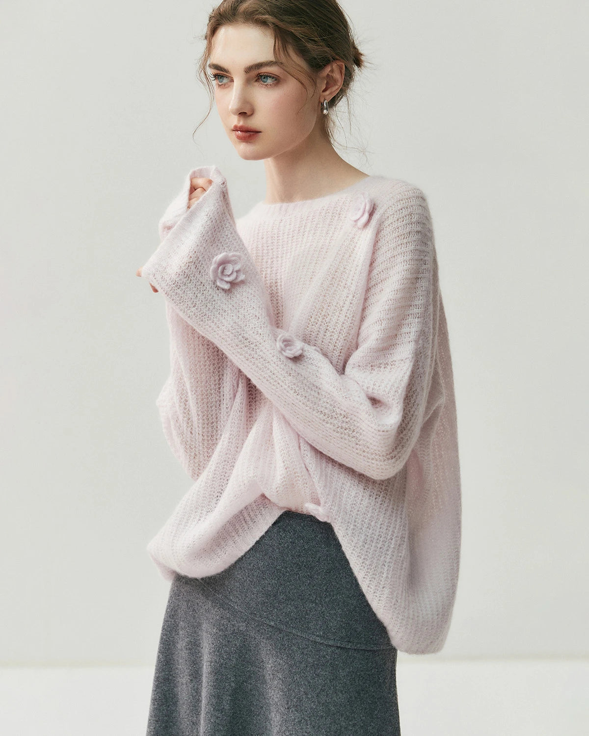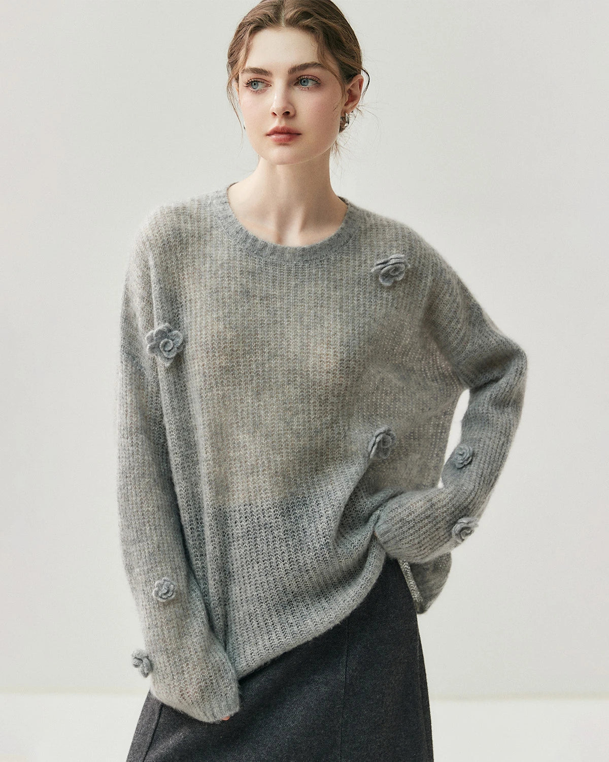 This crew neck oversized pullover stands out with its unique 3D floral knit details made from the same cashmere yarn. The delicate embellishment adds a feminine touch to the classic silhouette, making it a versatile option among cashmere pullover women styles and cool cashmere sweaters for modern wardrobes.