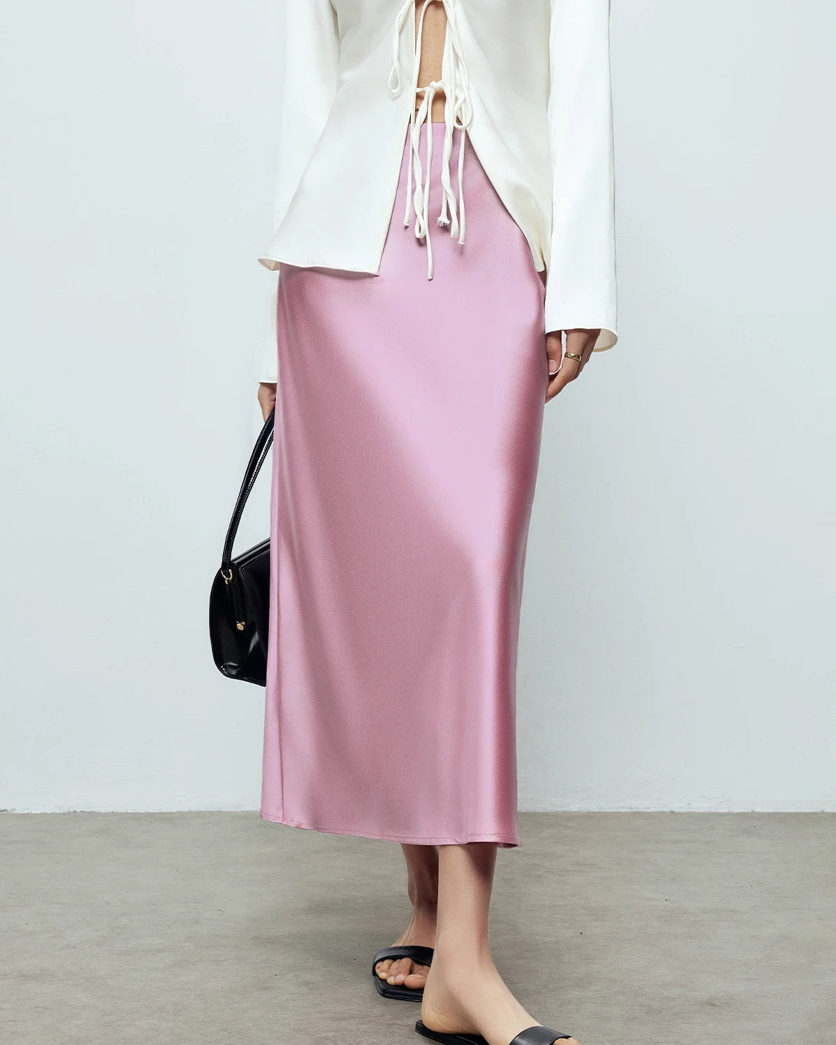 As autumn draws near, opt for a silk skirt in classic dark hues for an understated touch of sophistication. For instance, pairing a blush pink silk blouse with brown silk high-waisted midi skirt creates a perfect transitional harmony of colors, exuding an elegant demeanor.