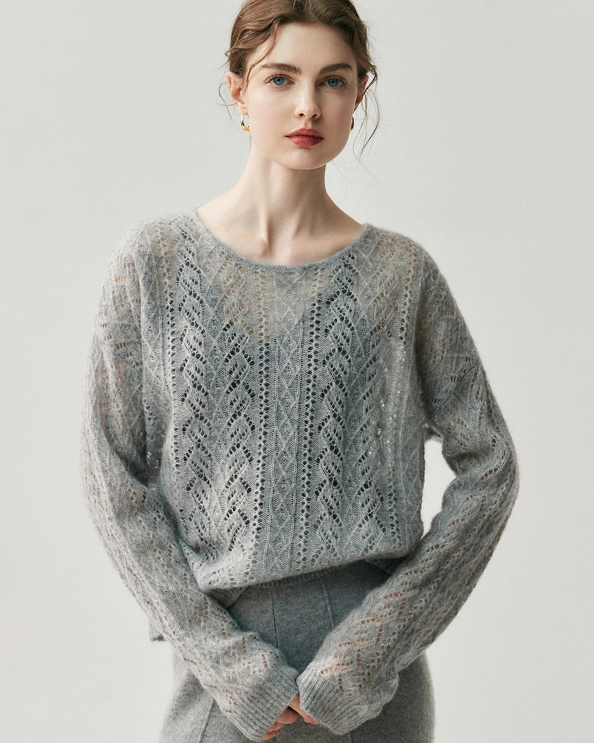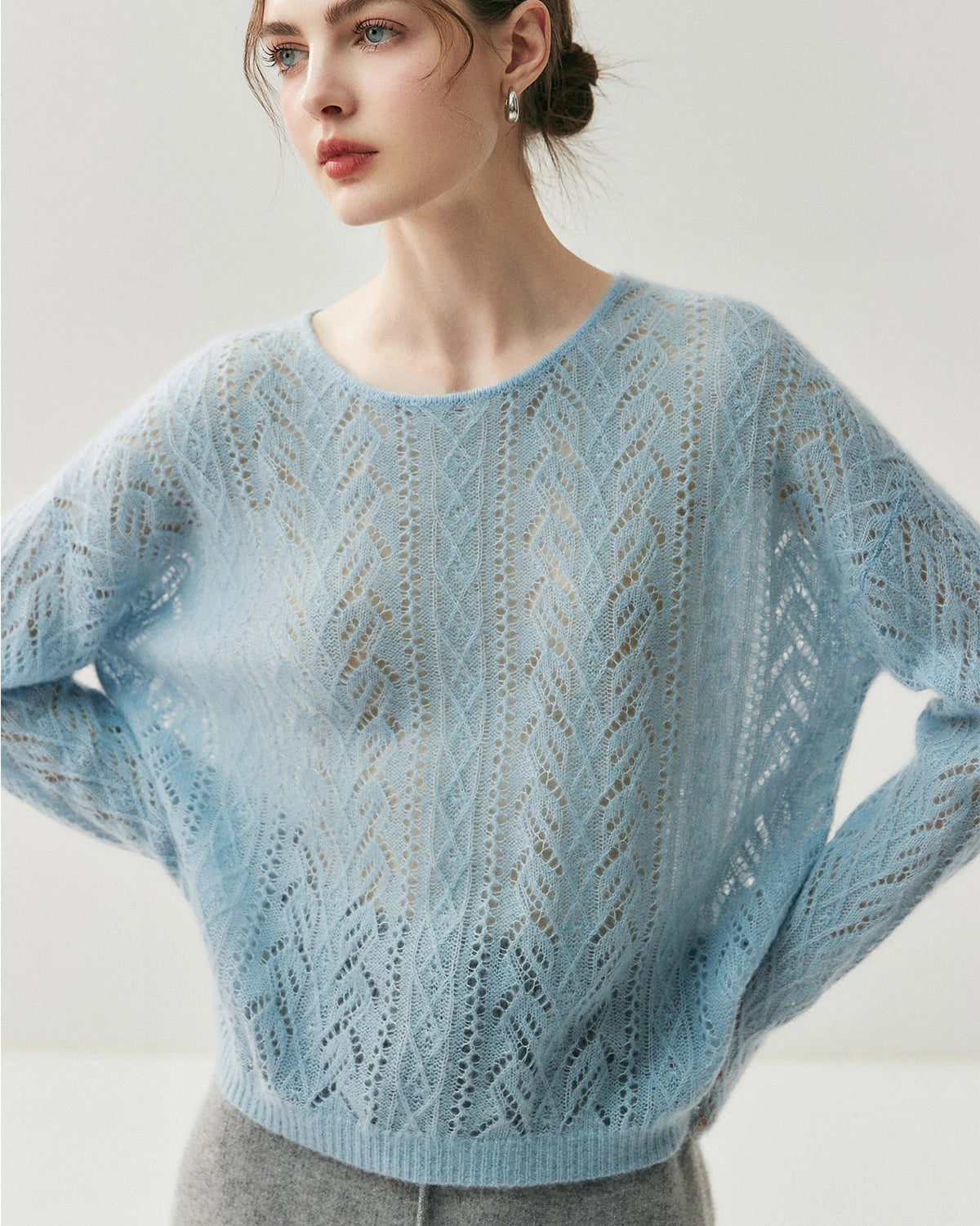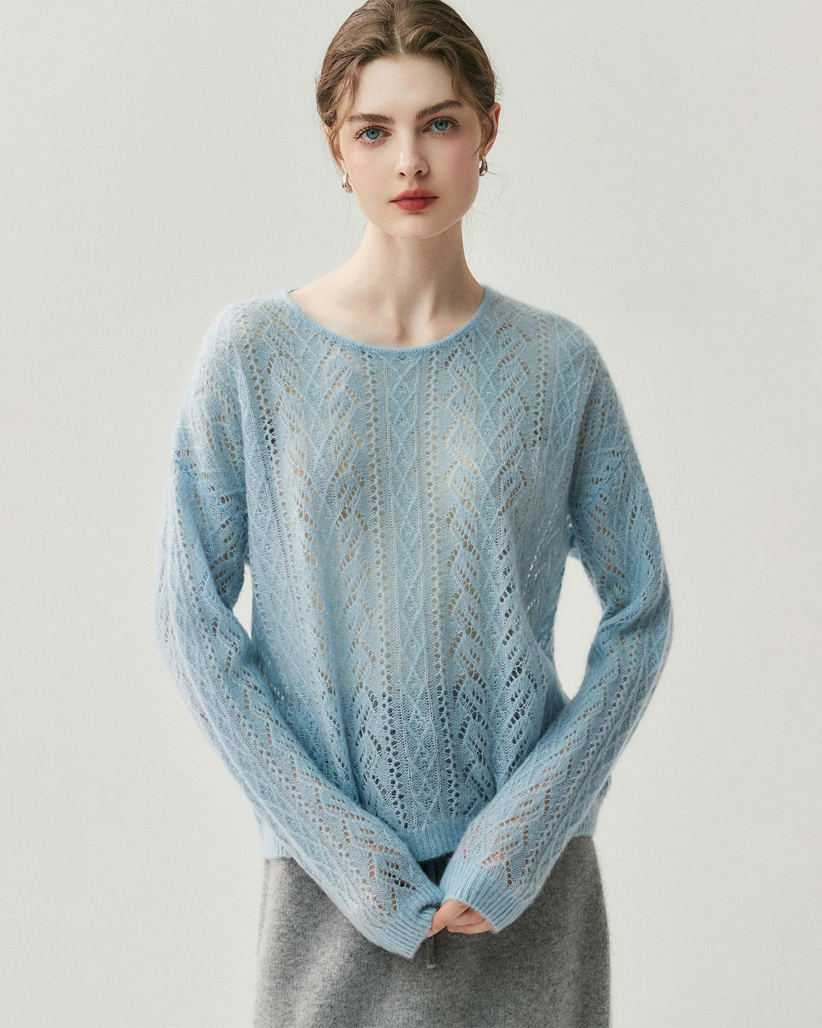 This lightweight crew neck pullover features delicate cable knit openwork with a refined silhouette. Designed as a classic cashmere pullover sweater, it highlights timeless style and modern versatility. The fine knit structure makes it perfect as a lightweight cashmere sweater for women, offering elegance that transitions easily from day to night.