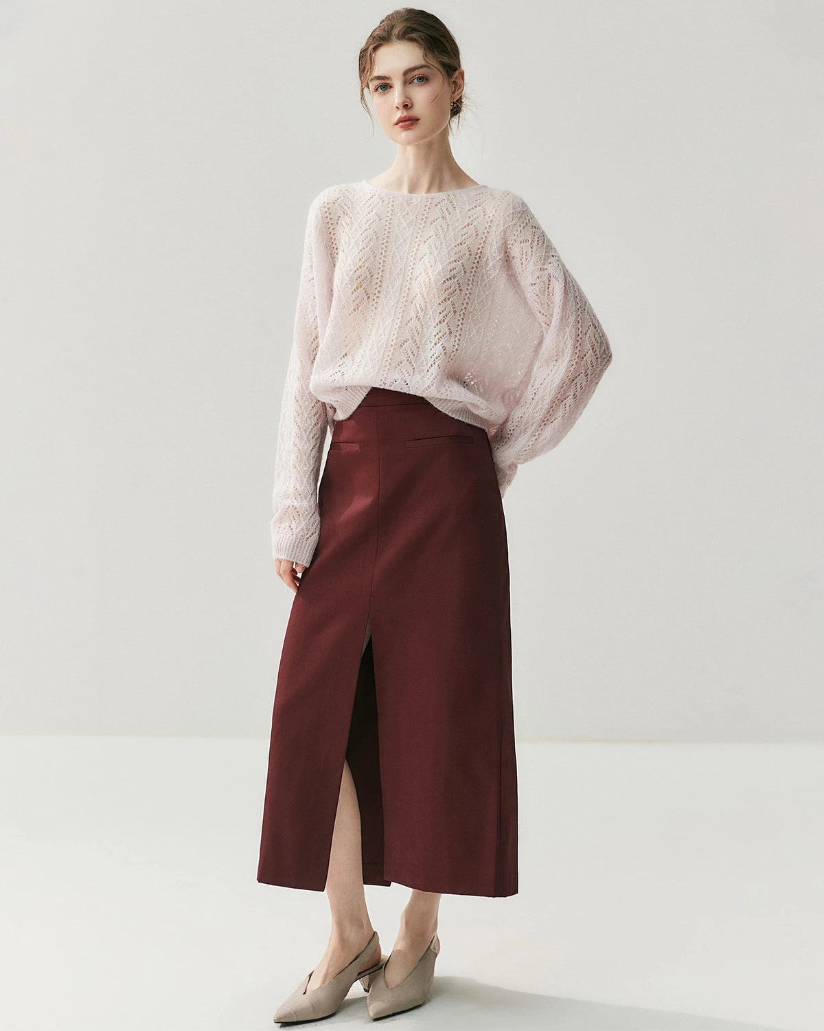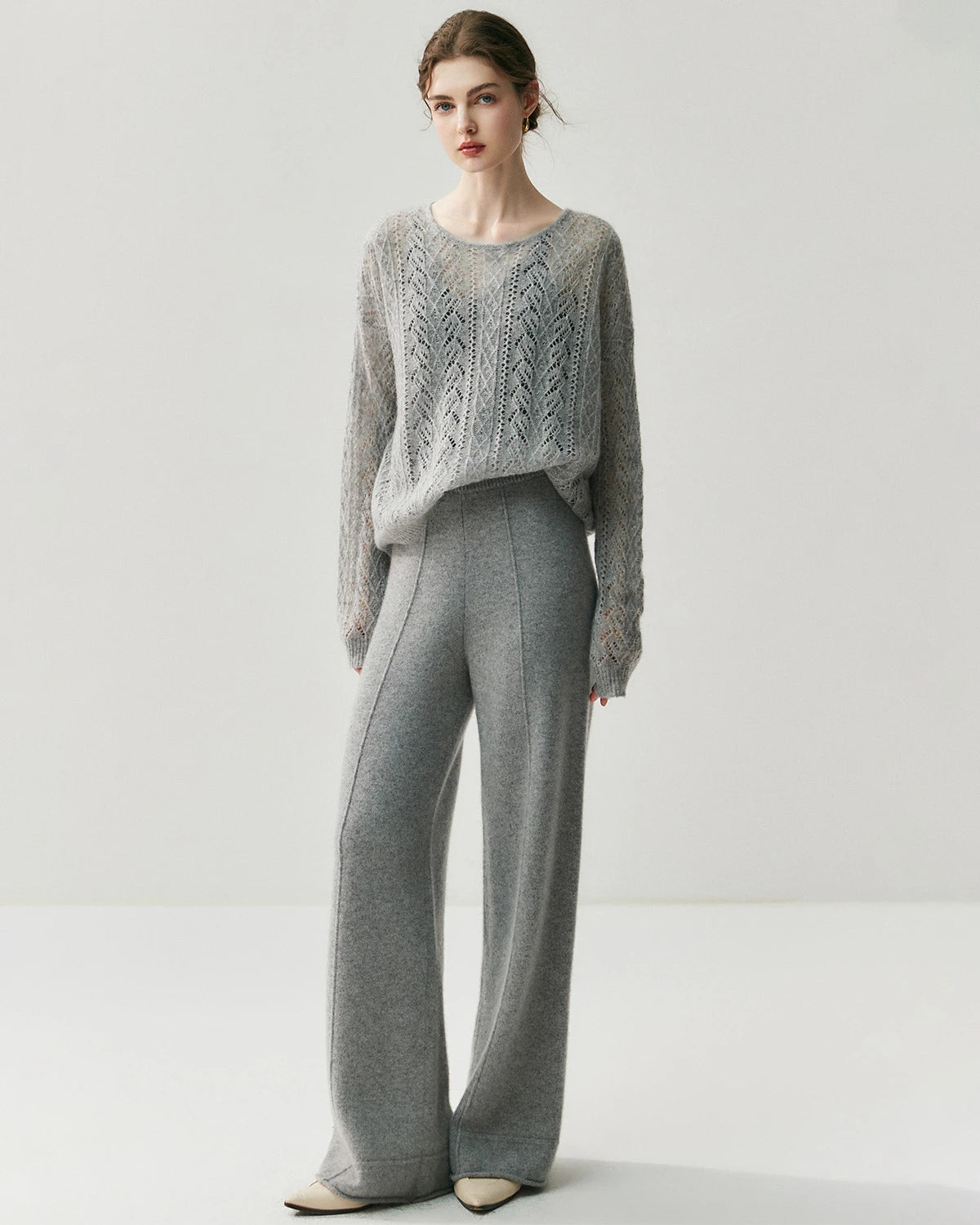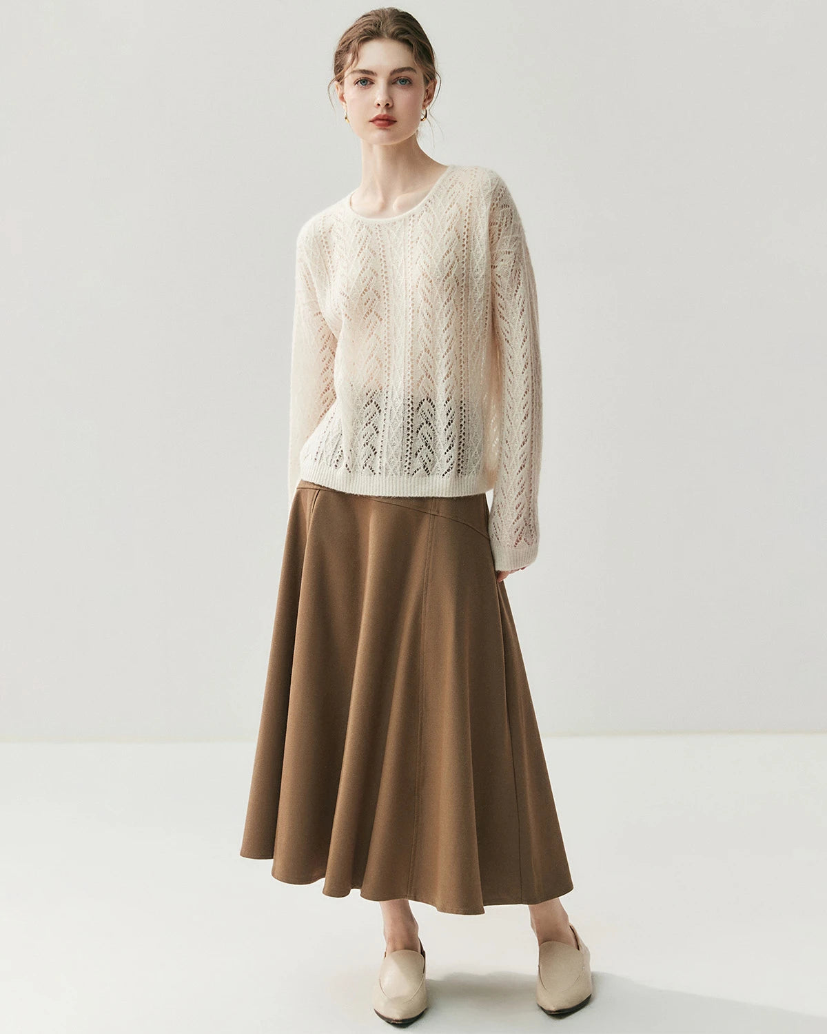 This lightweight crew neck pullover features delicate cable knit openwork with a refined silhouette. Designed as a classic cashmere pullover sweater, it highlights timeless style and modern versatility. The fine knit structure makes it perfect as a lightweight cashmere sweater for women, offering elegance that transitions easily from day to night.