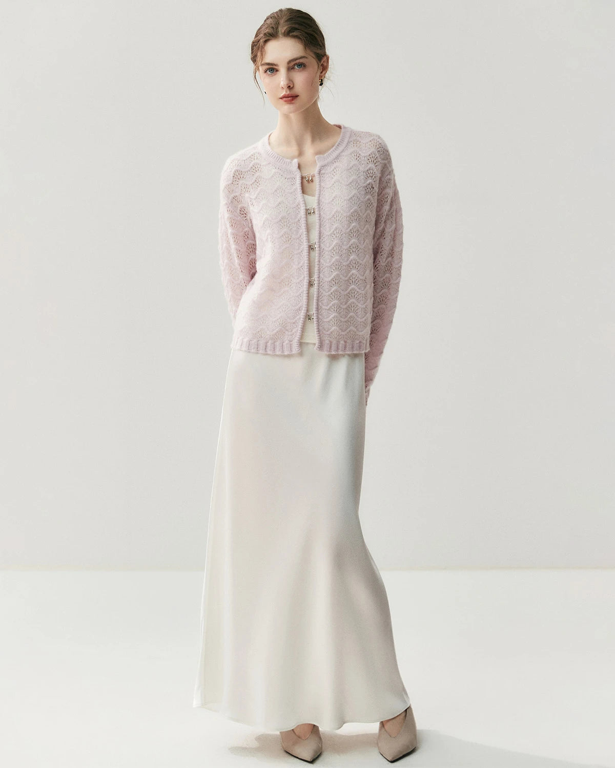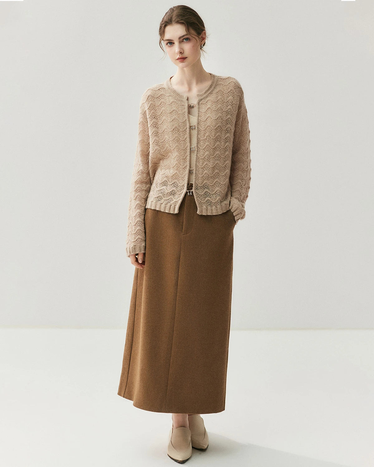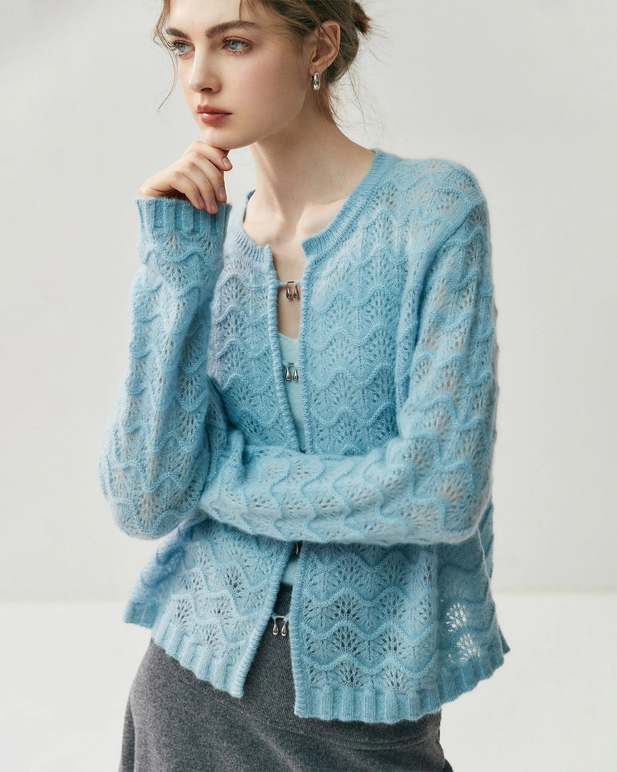 This round neck front open cardigan features an open-knit pattern with delicate hollowed floral details, giving it a semi-sheer and stylish look. The unique teardrop-shaped metal buttons replace conventional closures, elevating this cashmere cardigan sweater with a chic and modern twist.