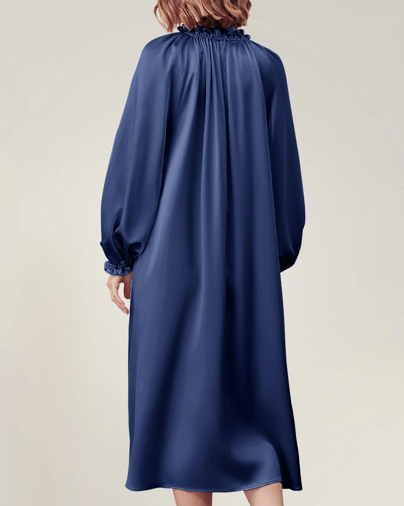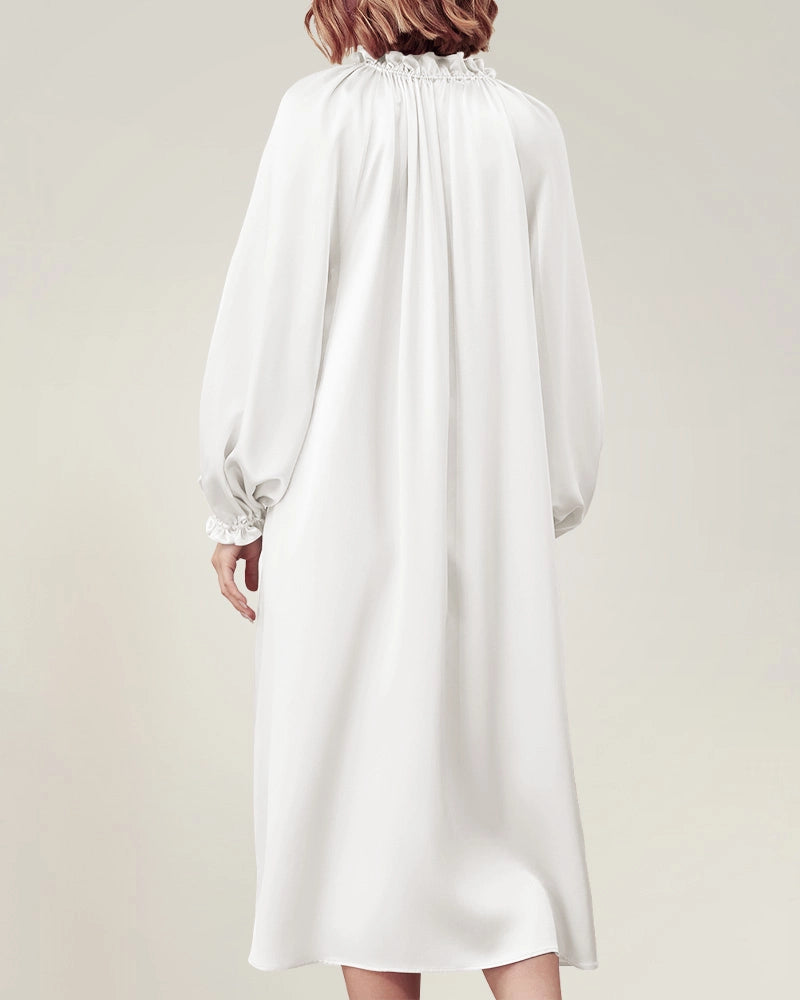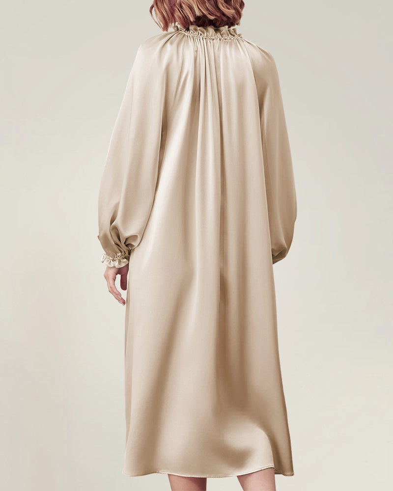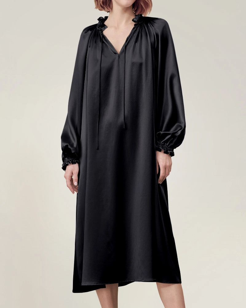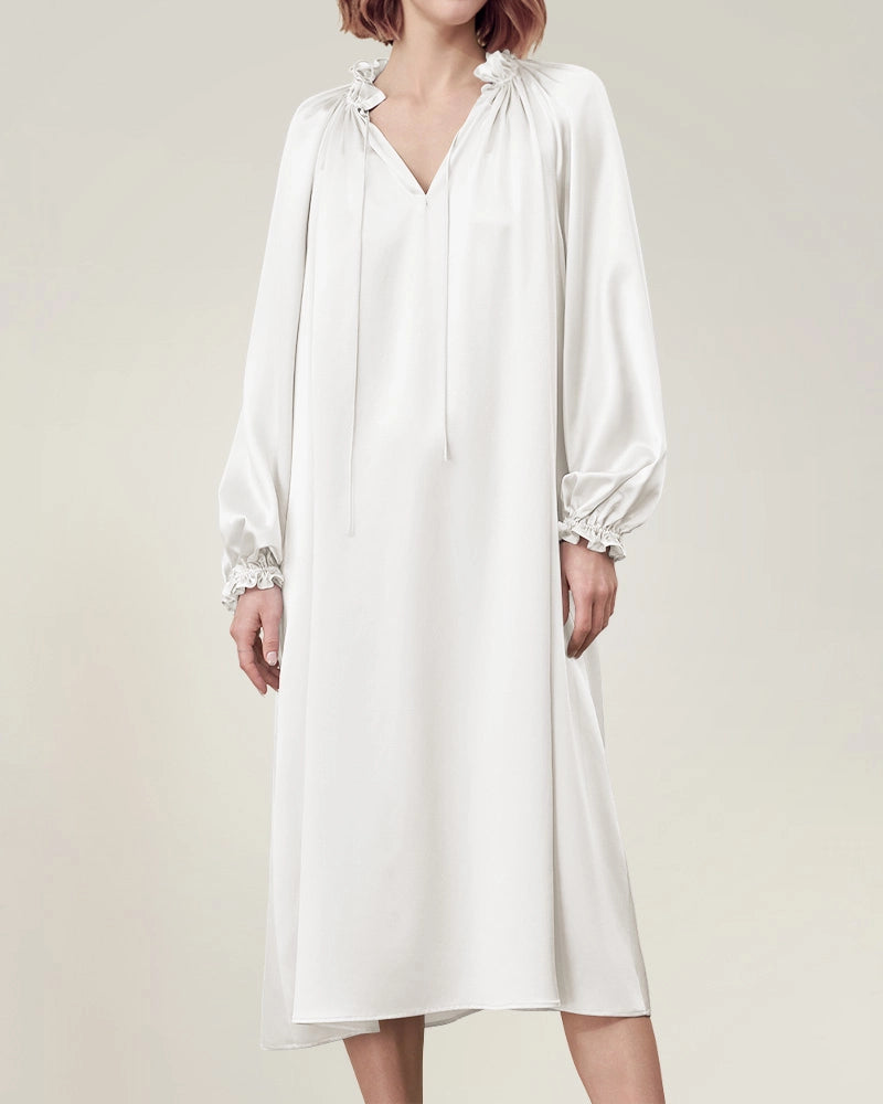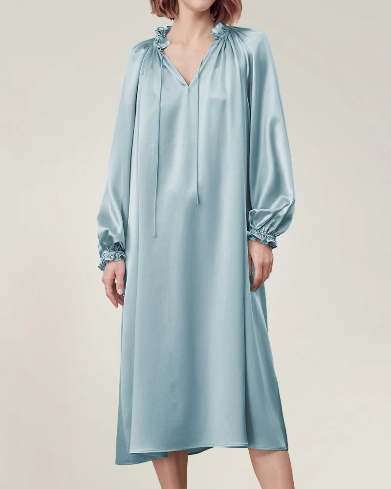 Featuring a loose fit and a ruffle trim slit neck with an adjustable tie detail, this women's nightgown evokes the charm of a vintage nightgown or victorian nightdress. The long sleeves and soft drape create an effortlessly graceful look, reminiscent of victorian era nightgown silhouettes. Its mid-length cut and elegant neckline make this ladies silk nightgown a timeless addition to any collection of womens silk nighties or ladies silk nighties.