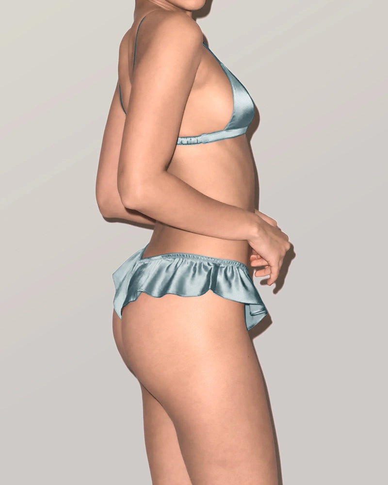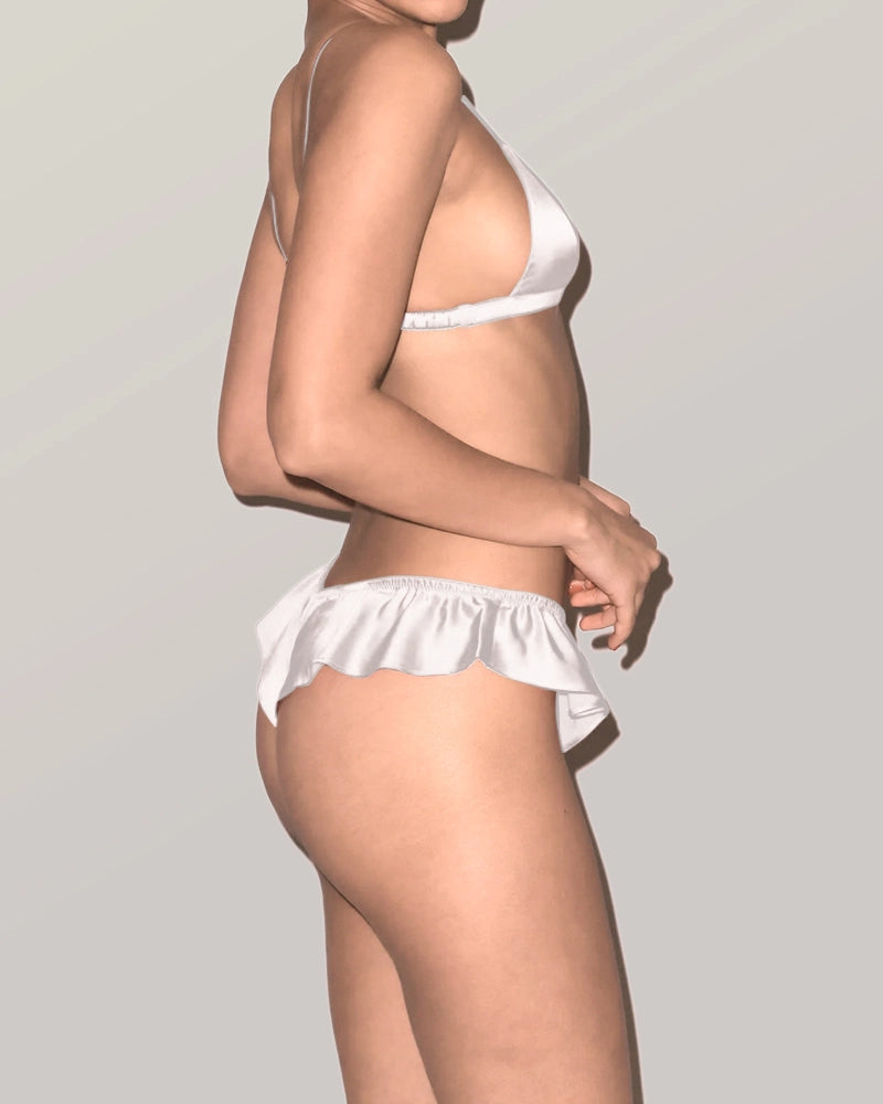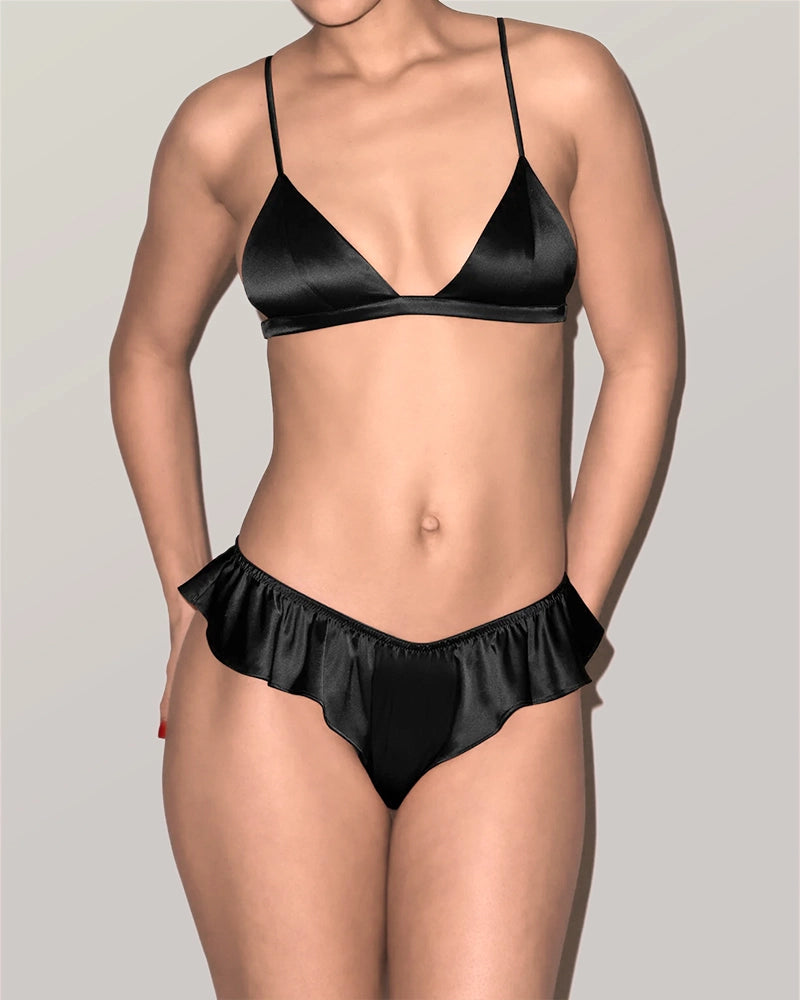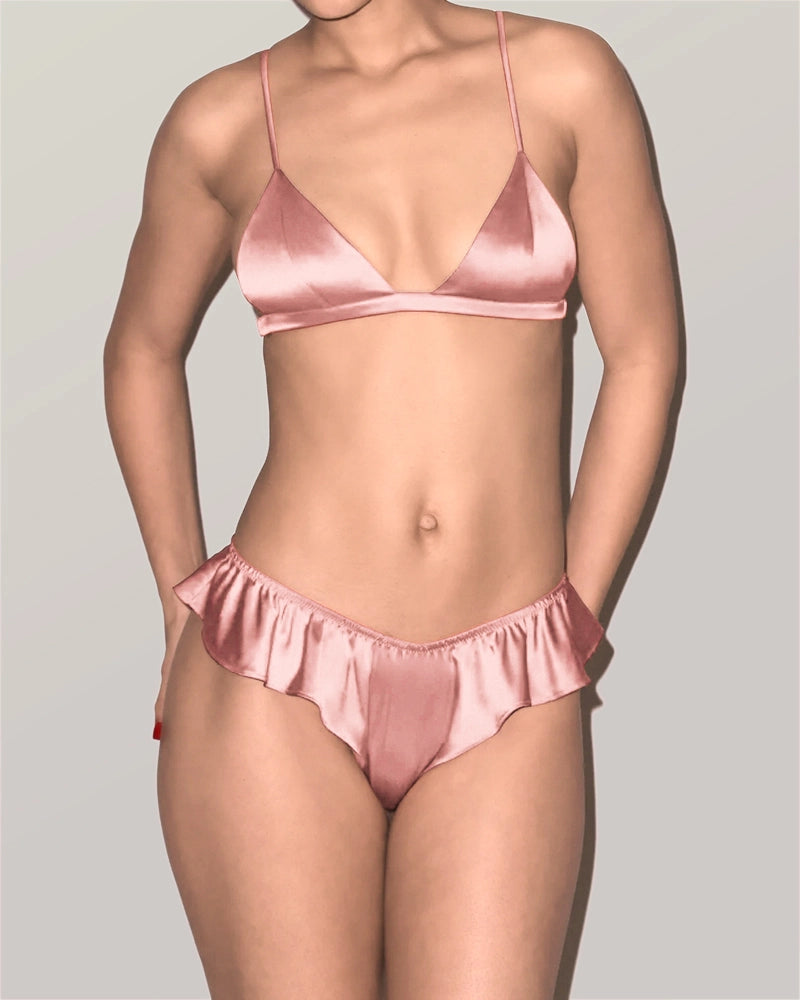 The set includes a wireless triangle bra and a matching ruffle trim flutter thong. The silk bralette gently shapes the bust with a soft, natural silhouette, while the playful flutter edge adds a feminine charm. Designed for those who appreciate silk bras and panties with a refined yet romantic touch, this pairing embodies effortless sophistication.