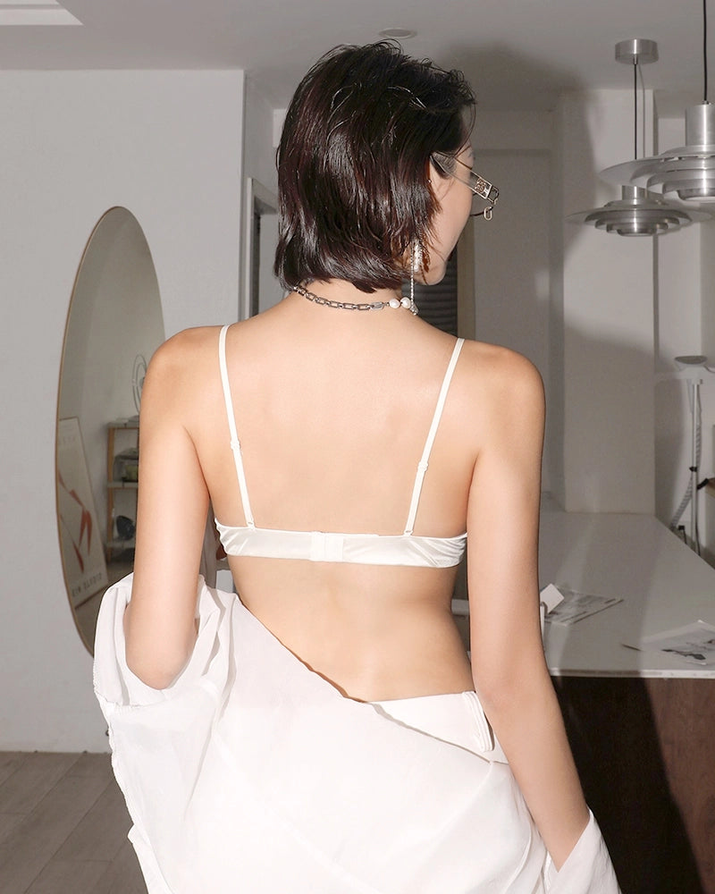 This wireless triangle bralette features a unique U shape underband that gently follows the curve of the body, ensuring a comfortable and secure fit. The open-back straight strap design is finished with an adjustable closure for a personalized feel. Elegant enough to wear alone and versatile enough to style under an open shirt or blazer, it’s a silk wireless bra designed for both layering and standalone wear.