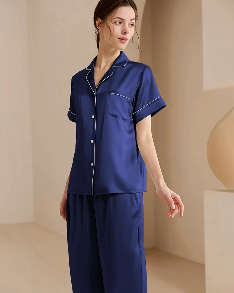 With a clean short-sleeve top and full-length pants, this silky women's pajama set is made for both comfort and polish. Choose from white silk pajama set, black silk pjs womens, pink silk pjs, or navy to match your style. Piping details add a timeless finish — perfect for a bride getting ready on the big day.