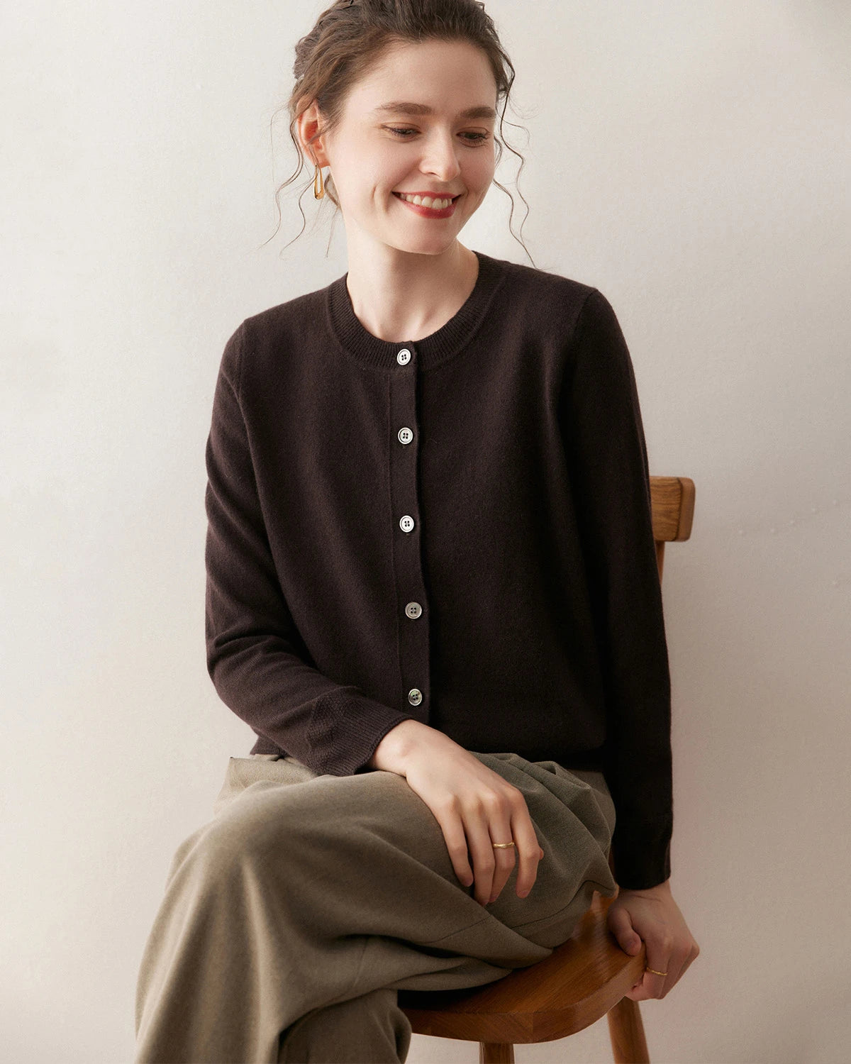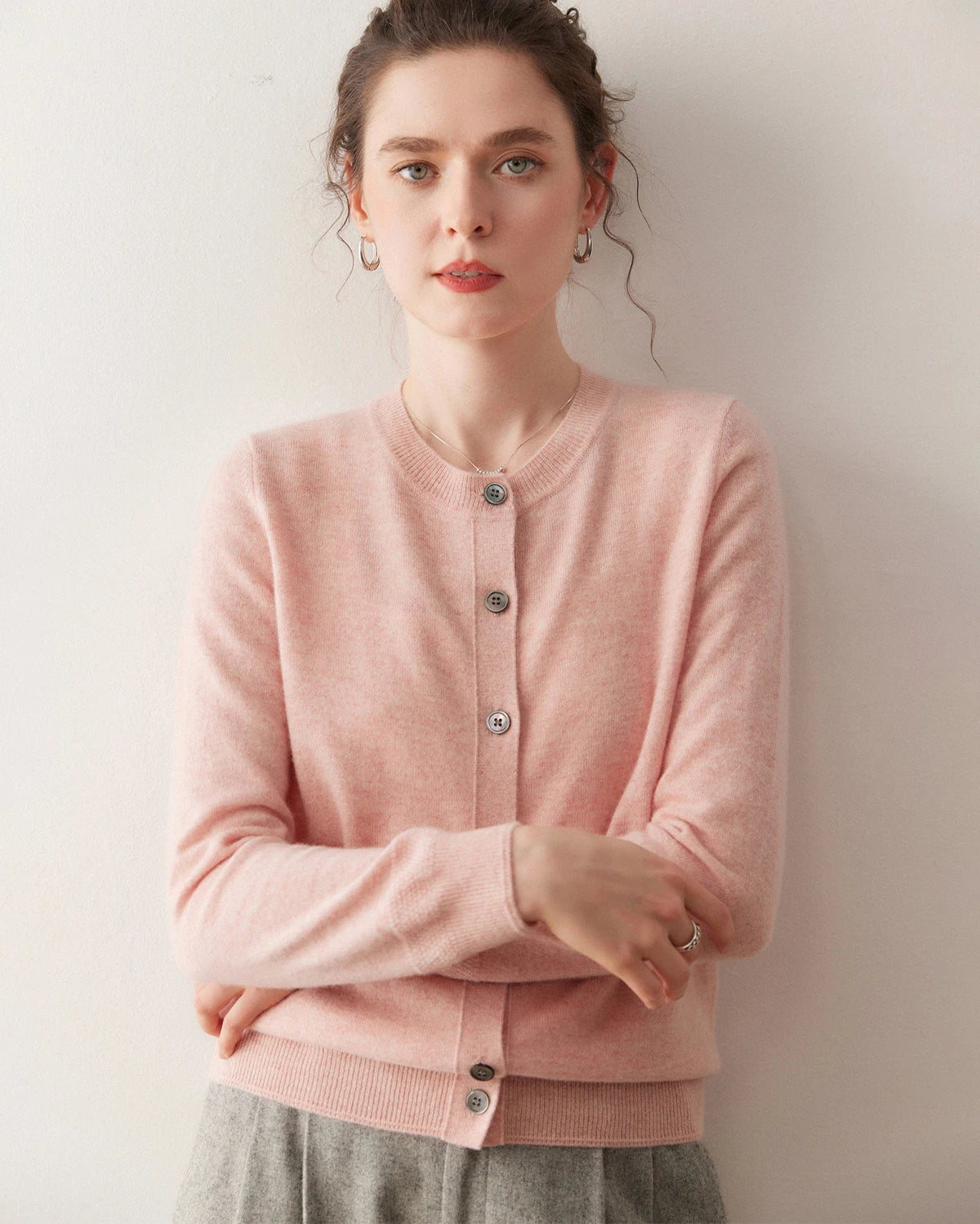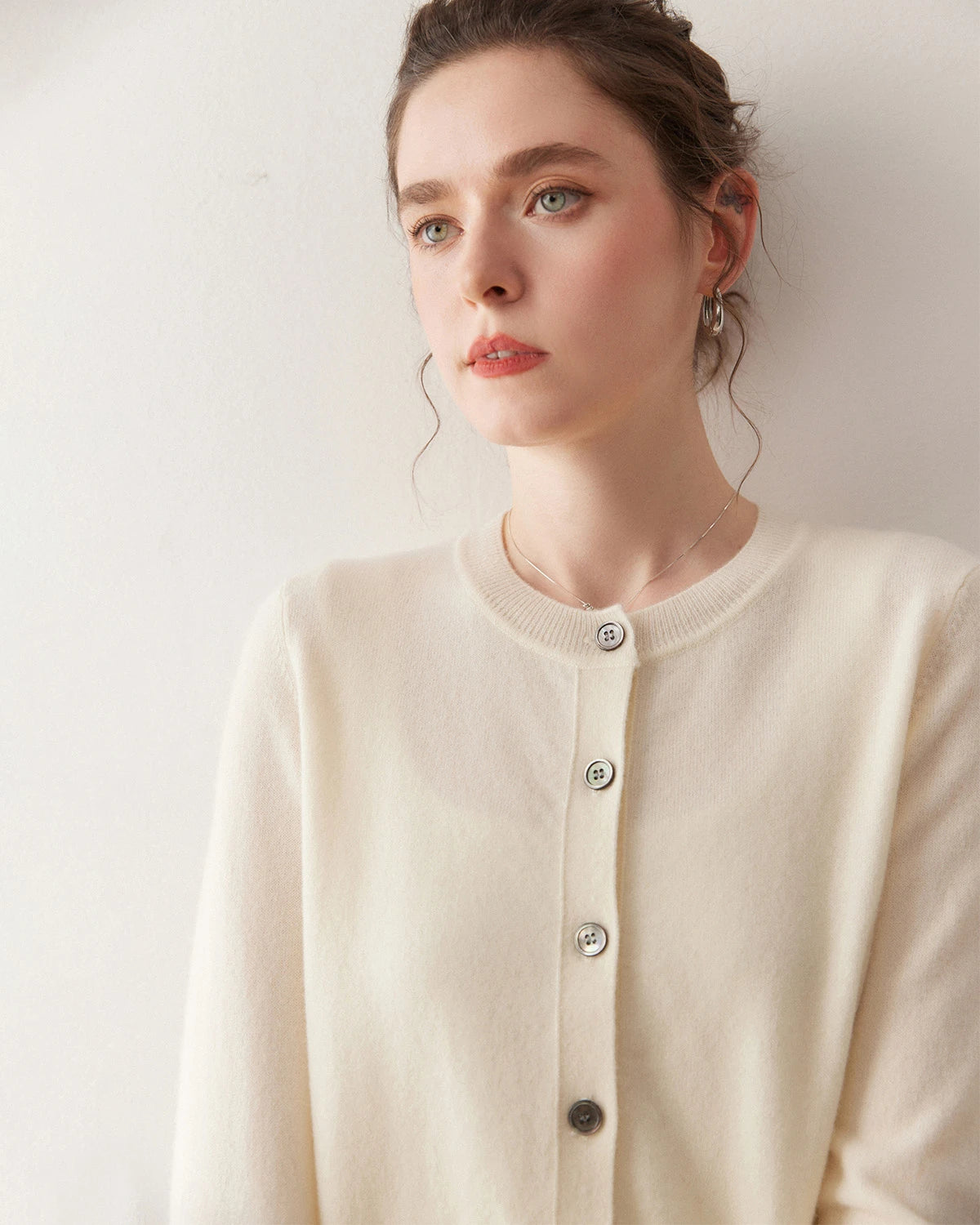 This classic ladies cashmere cardigan features a minimalist silhouette with elegant natural shell buttons. Its clean lines, neat shoulder seams, and subtle ribbed edges create a timeless and versatile piece that pairs effortlessly with any outfit. The lightweight knit highlights the beauty of luxury cashmere sweater craftsmanship.