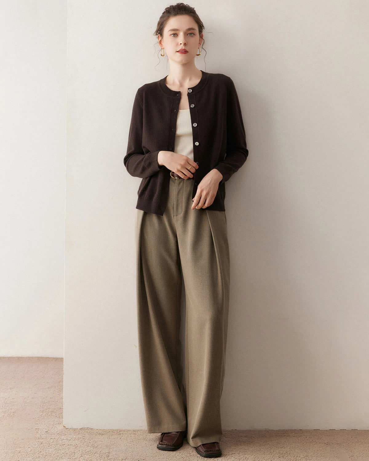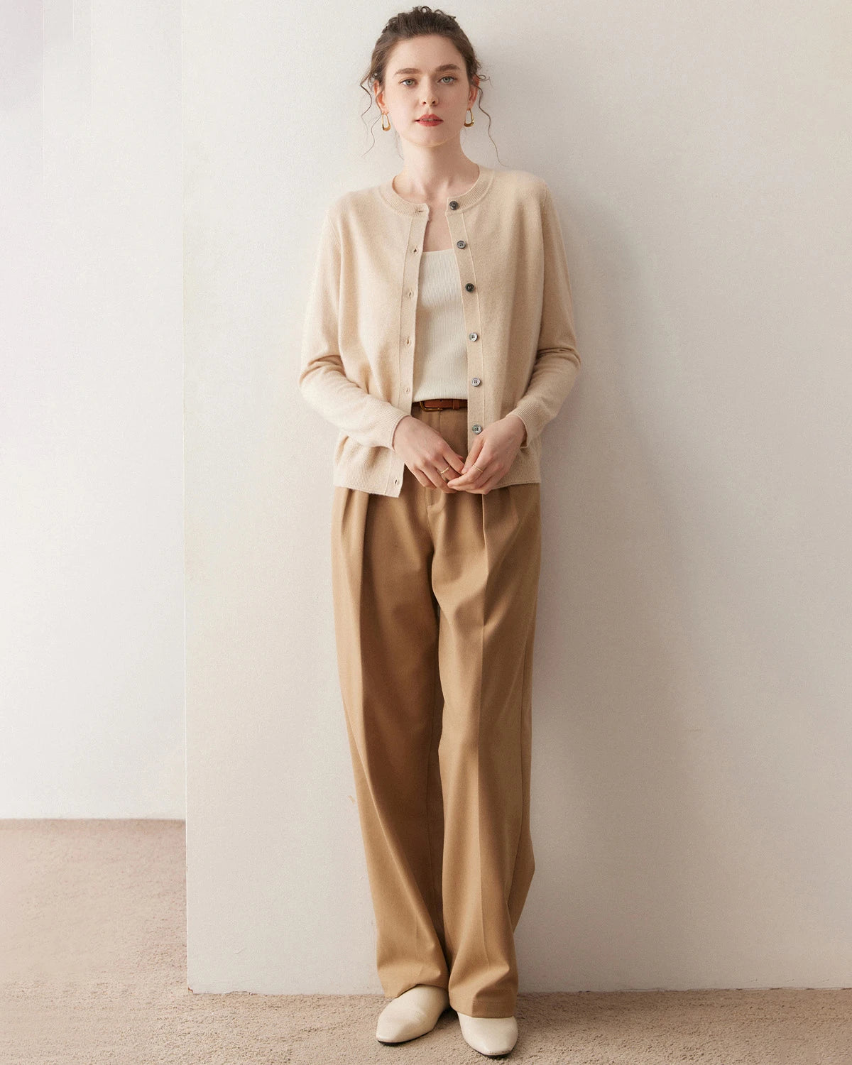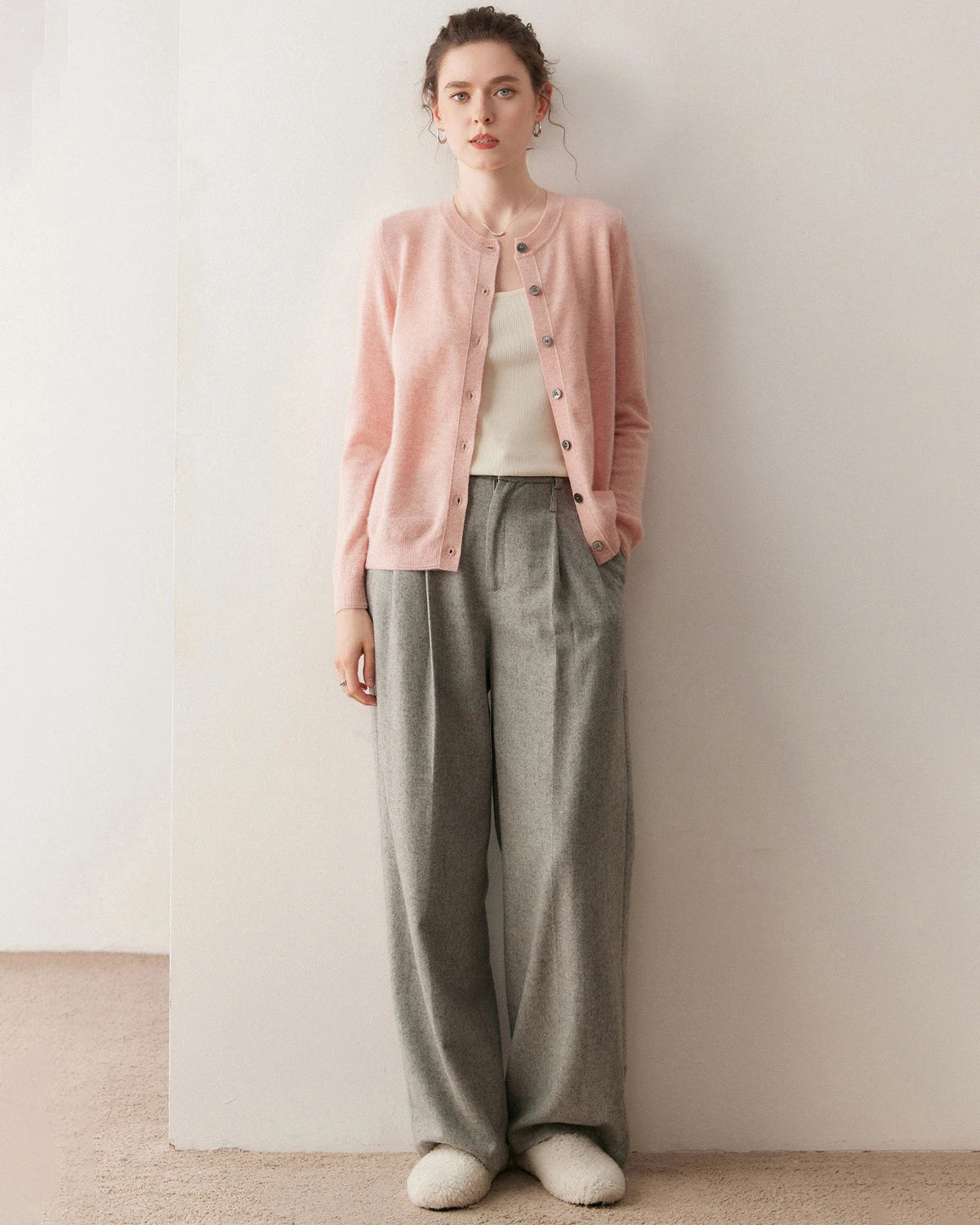 This classic ladies cashmere cardigan features a minimalist silhouette with elegant natural shell buttons. Its clean lines, neat shoulder seams, and subtle ribbed edges create a timeless and versatile piece that pairs effortlessly with any outfit. The lightweight knit highlights the beauty of luxury cashmere sweater craftsmanship.