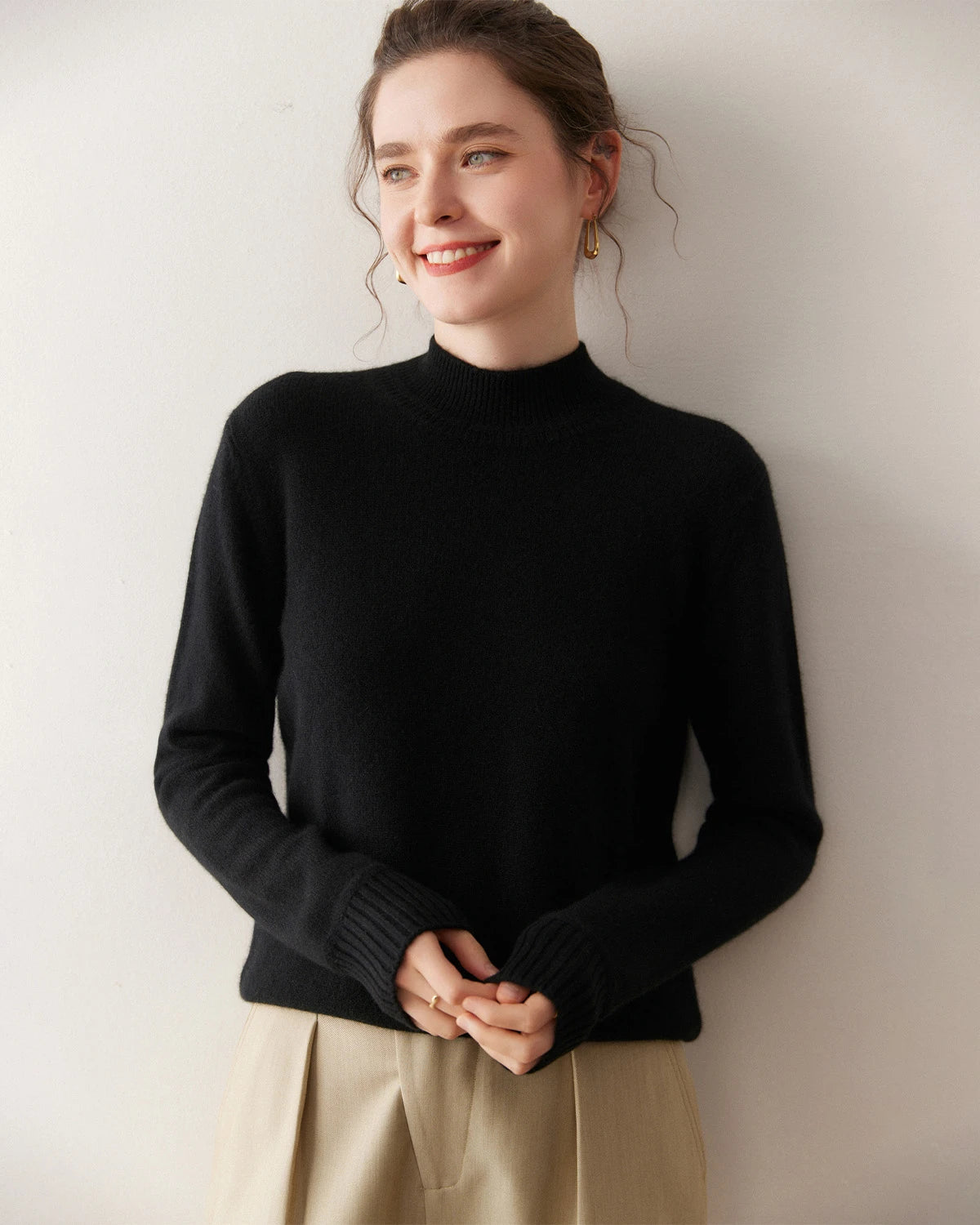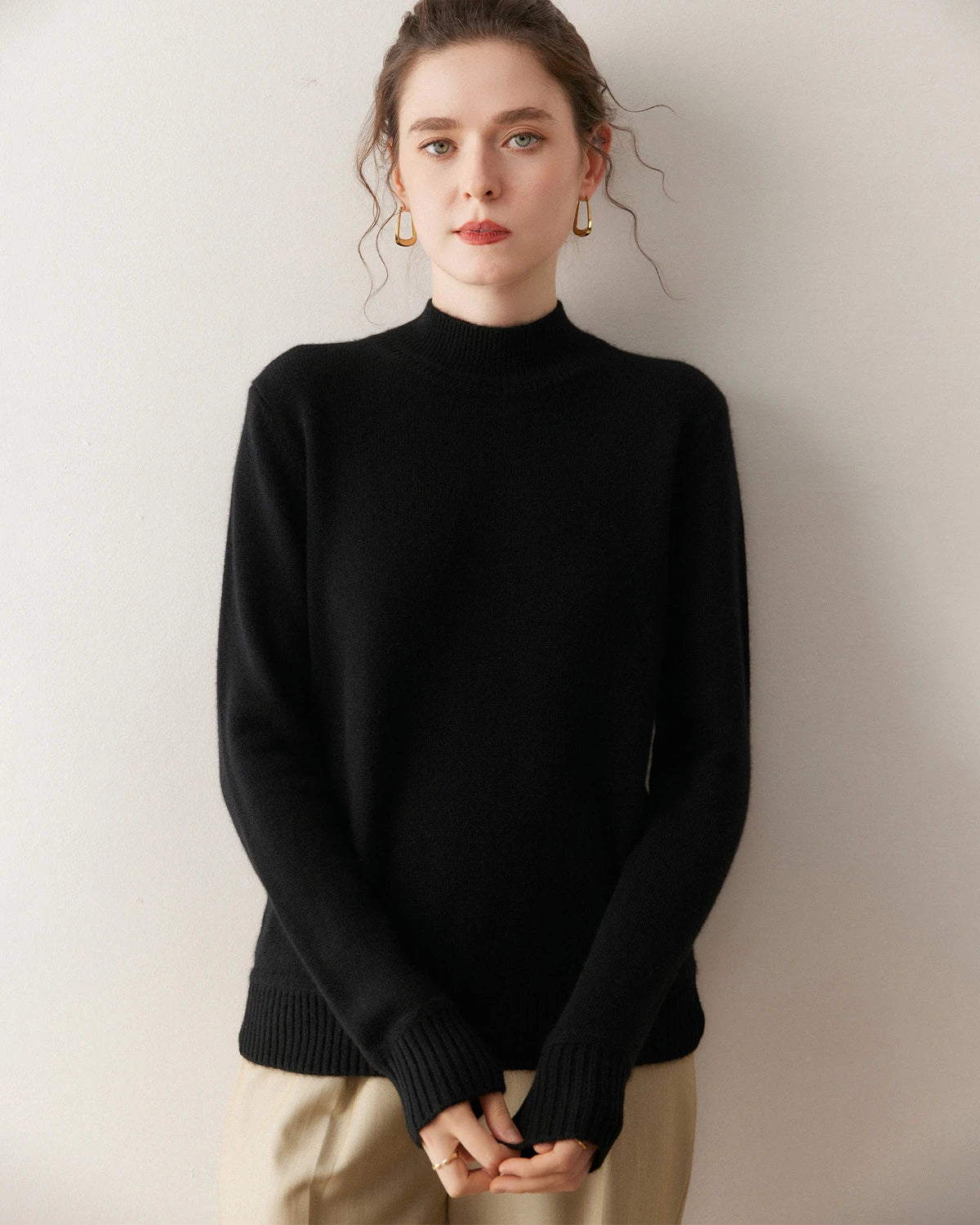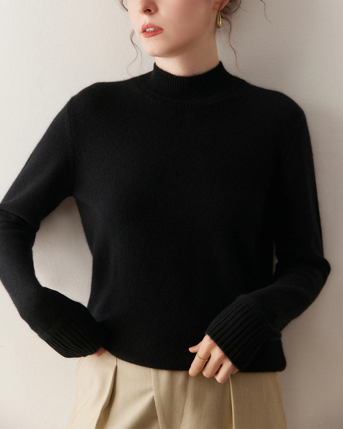 Designed with a sleek mock neck and a tailored silhouette, this cashmere pullover sweater captures effortless sophistication. The neckline sits gently higher than a crew neck but lower than a full turtleneck, giving a polished look that flatters the neckline while maintaining comfort and ease of wear.