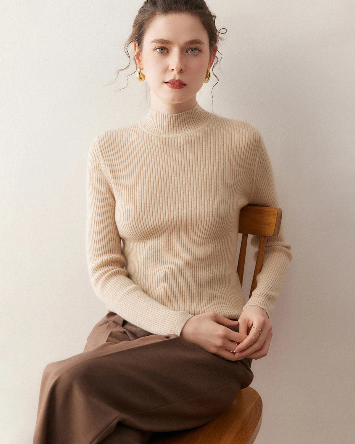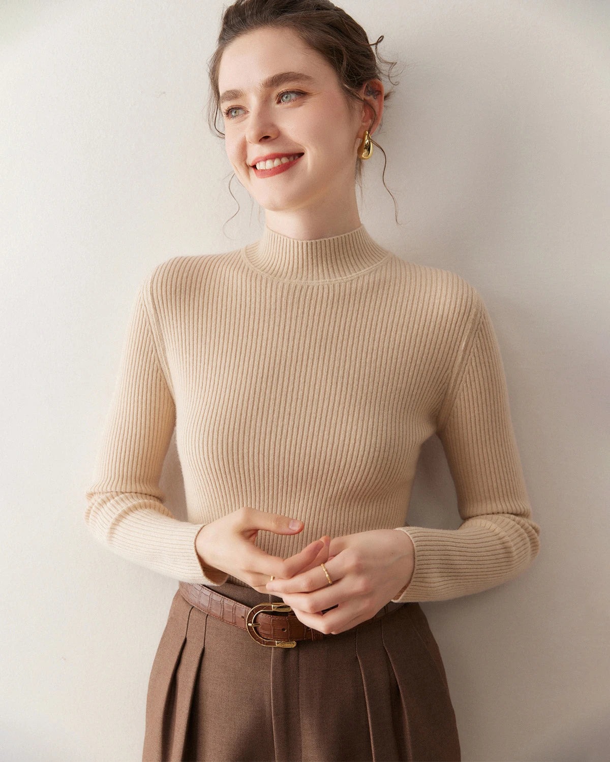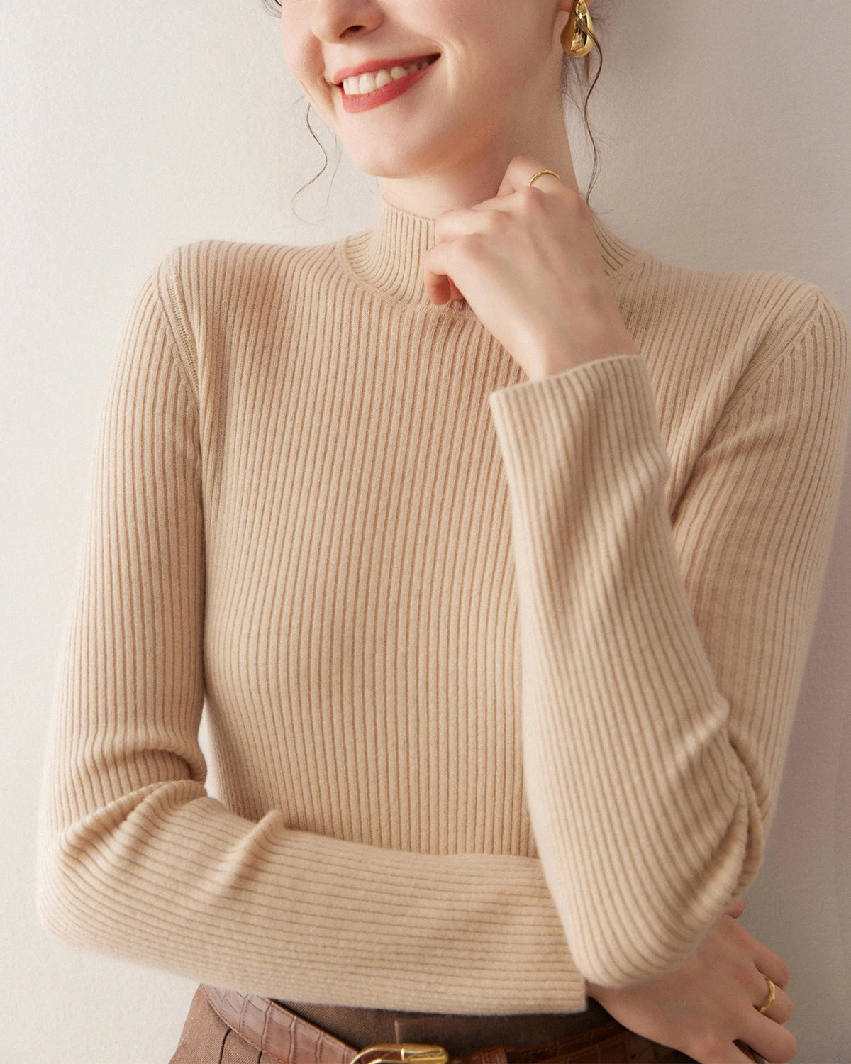 Fitted Embrace cashmere sweaters bring a sense of intimate elegance and are perfect for highlighting your figure. Try pairing them with a pencil skirt and heels for a sophisticated look or with skinny jeans and ankle boots for a chic ensemble. You can also accessorize with layered necklaces, a tailored blazer, or a waist belt. Complete your outfit with statement earrings and an elegant updo for a refined and stylish appearance.