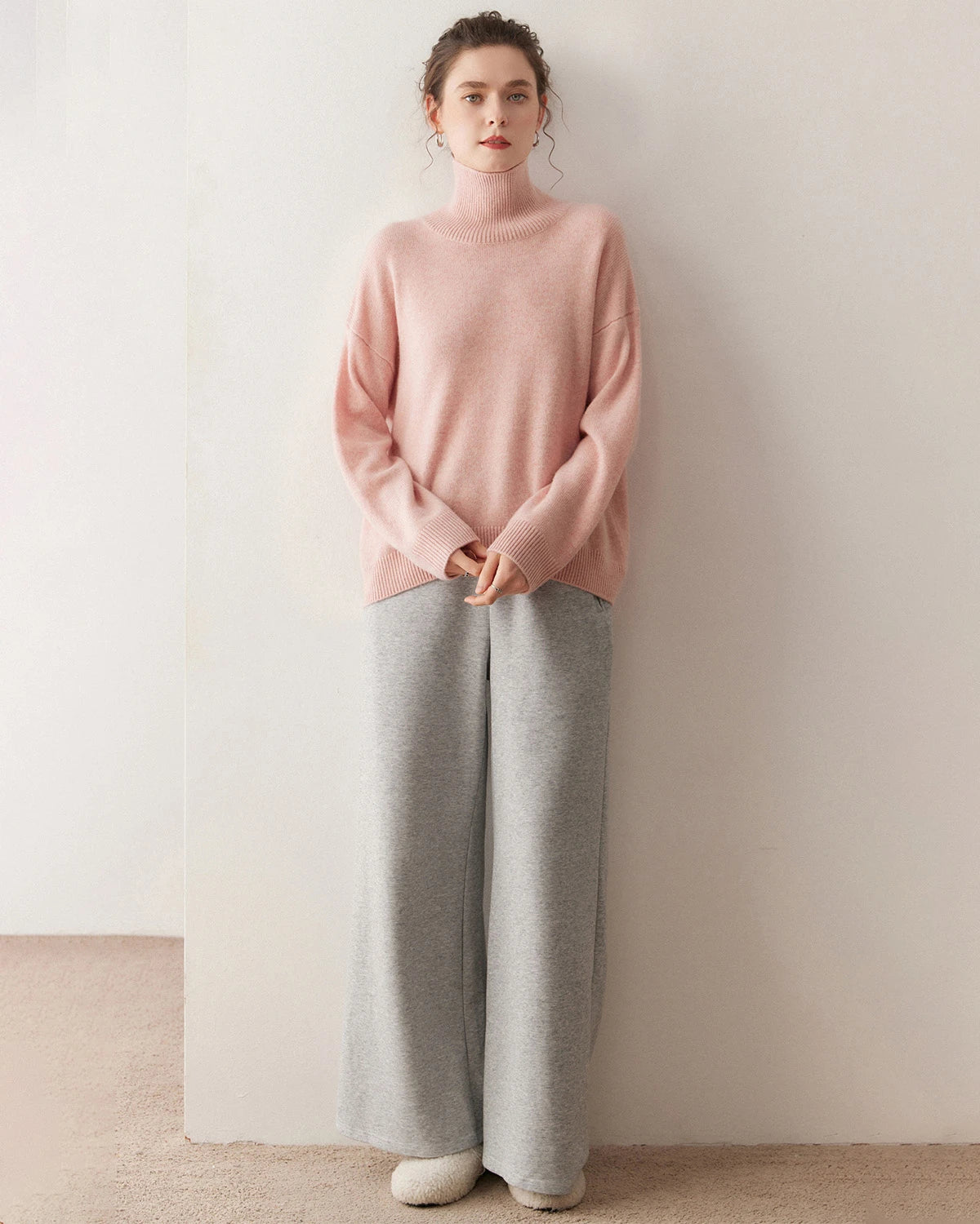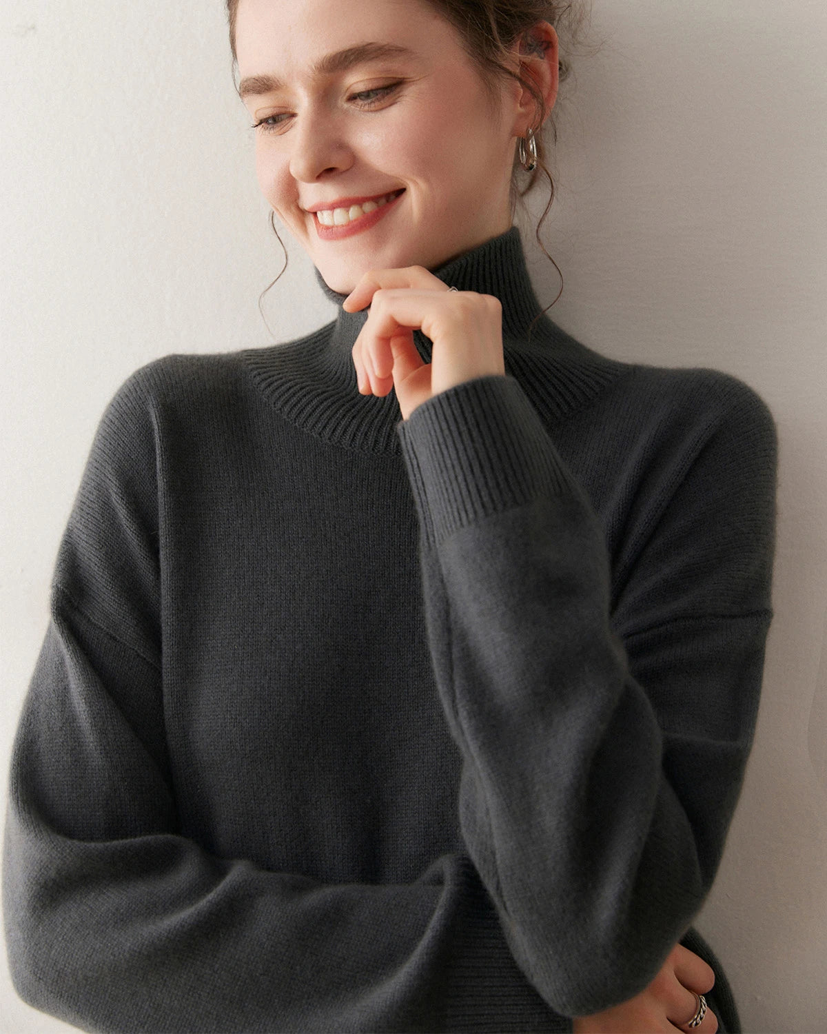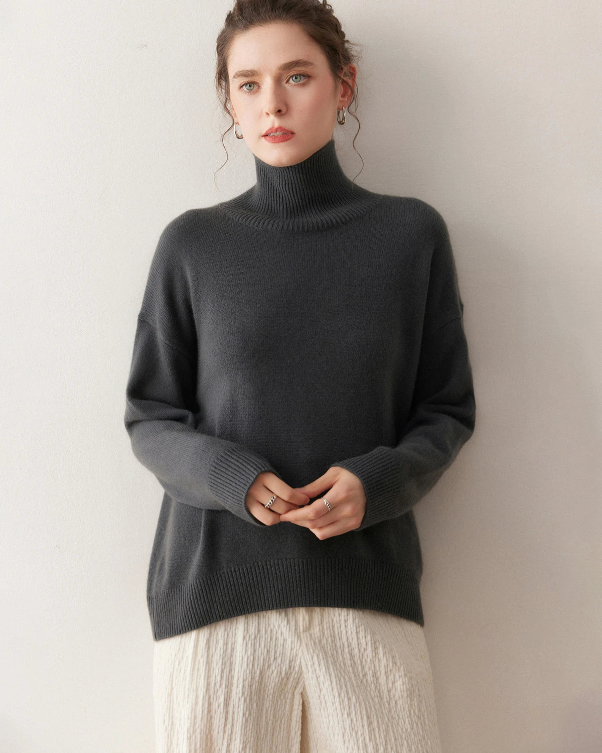 This relaxed cashmere turtleneck sweater features a drop shoulder silhouette and a high-low hem, combining comfort with contemporary style. The oversized fit gives it a laid-back yet elegant look, making it an essential womens cashmere pullover for modern wardrobes.