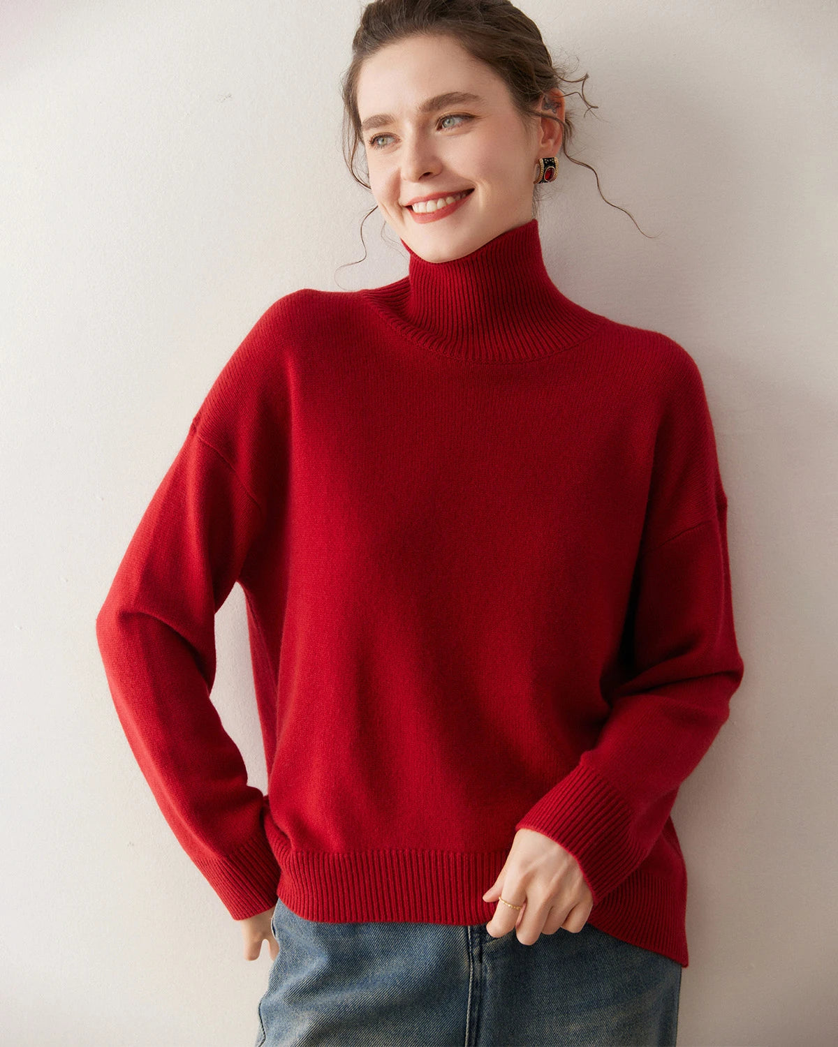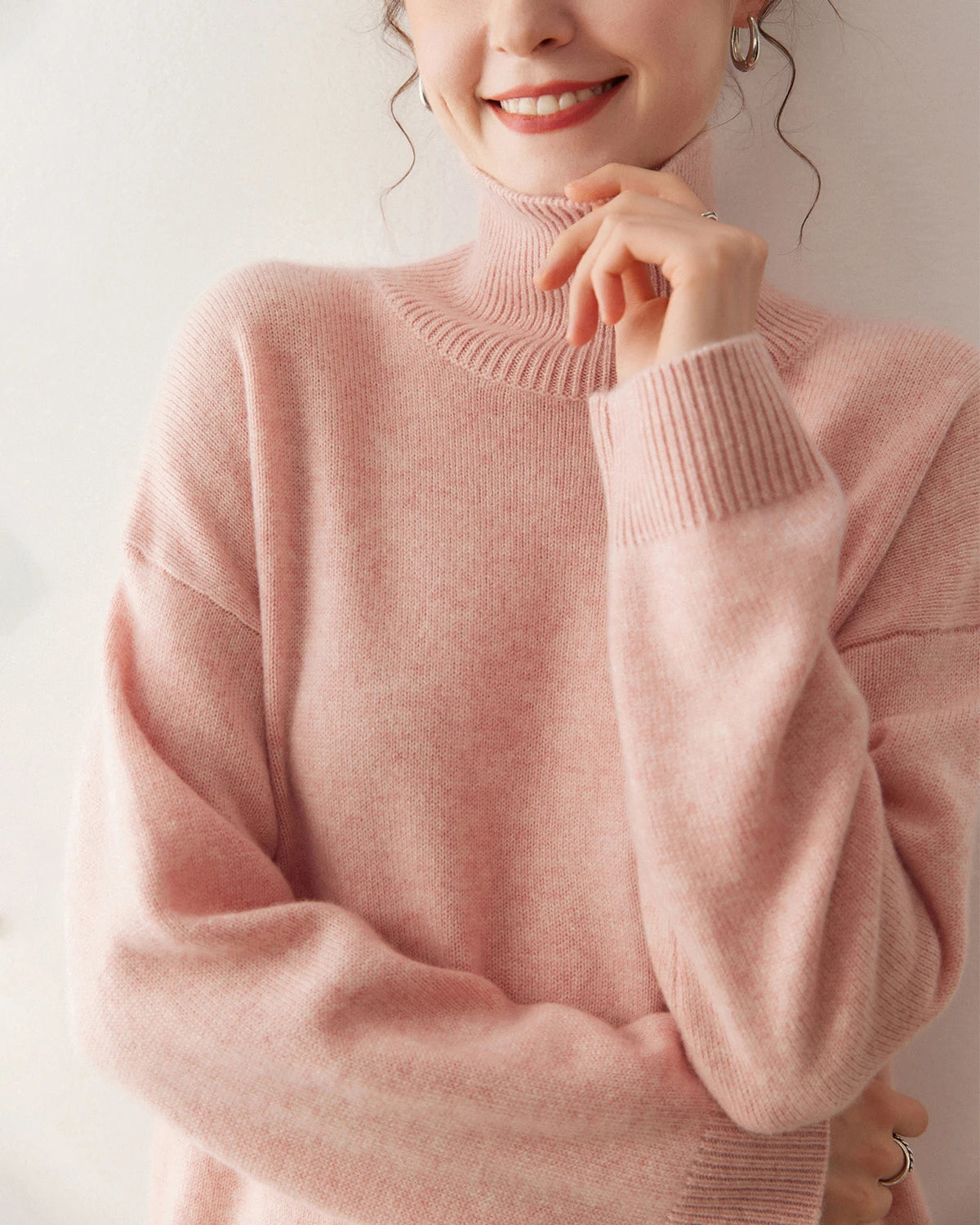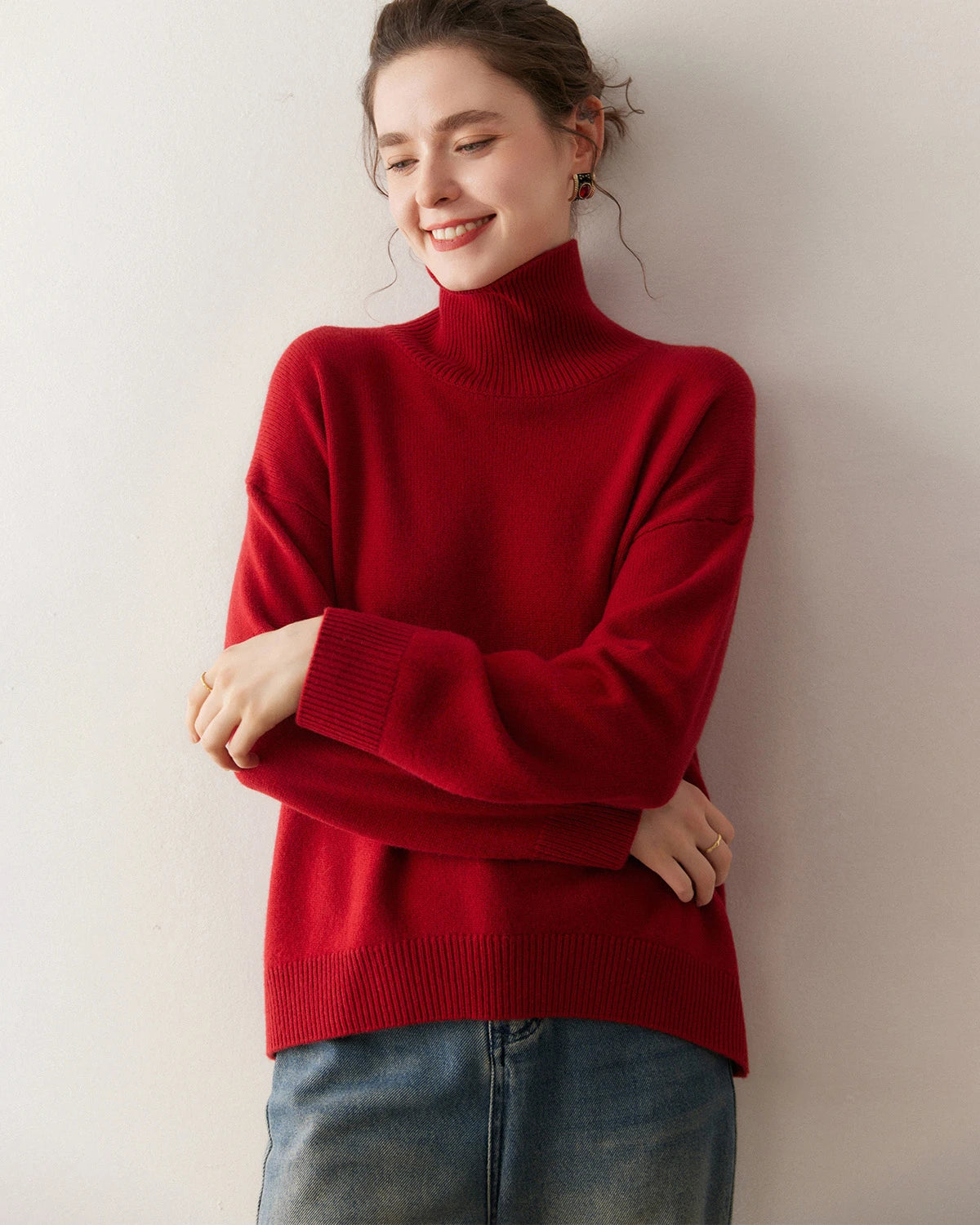 This relaxed cashmere turtleneck sweater features a drop shoulder silhouette and a high-low hem, combining comfort with contemporary style. The oversized fit gives it a laid-back yet elegant look, making it an essential womens cashmere pullover for modern wardrobes.