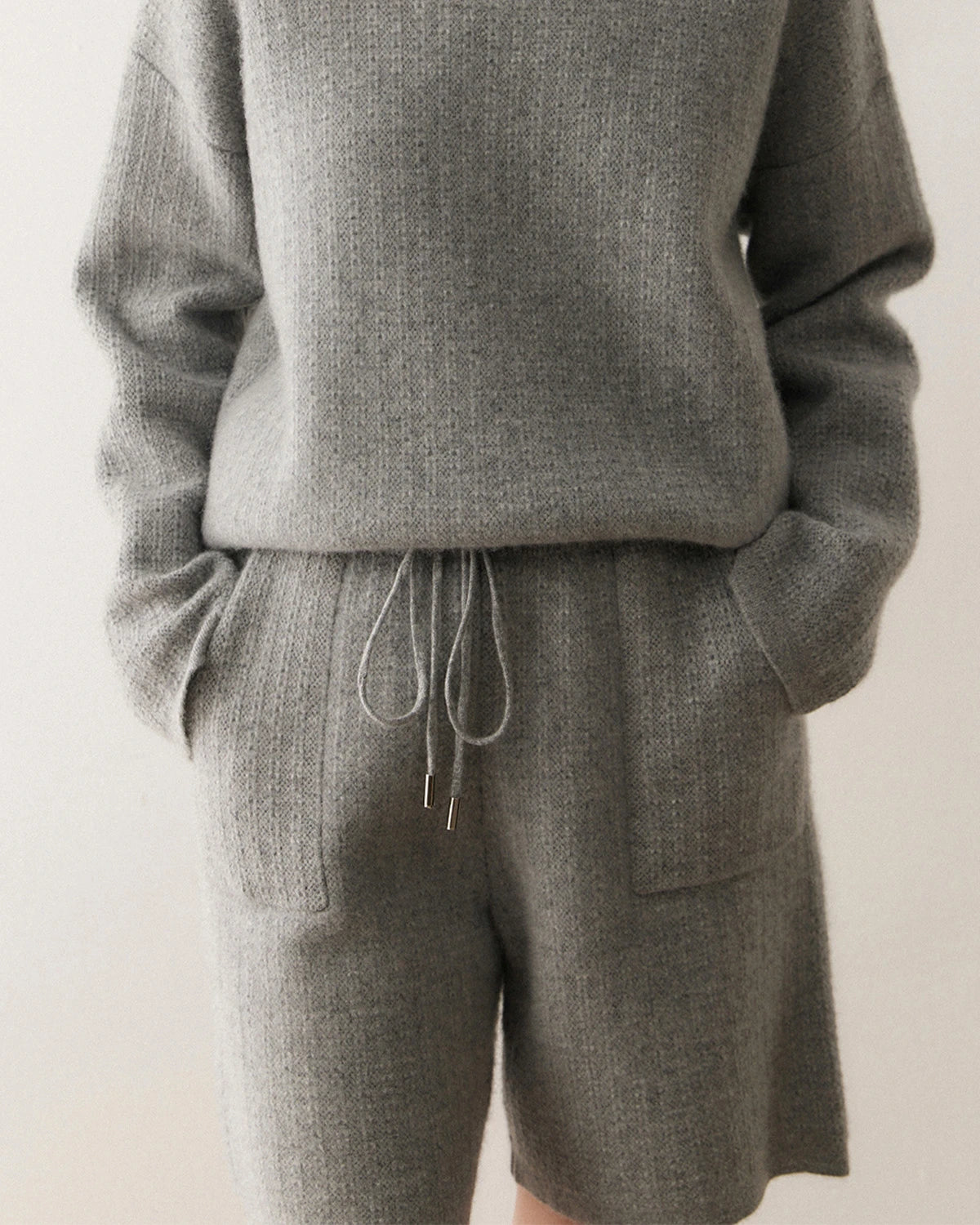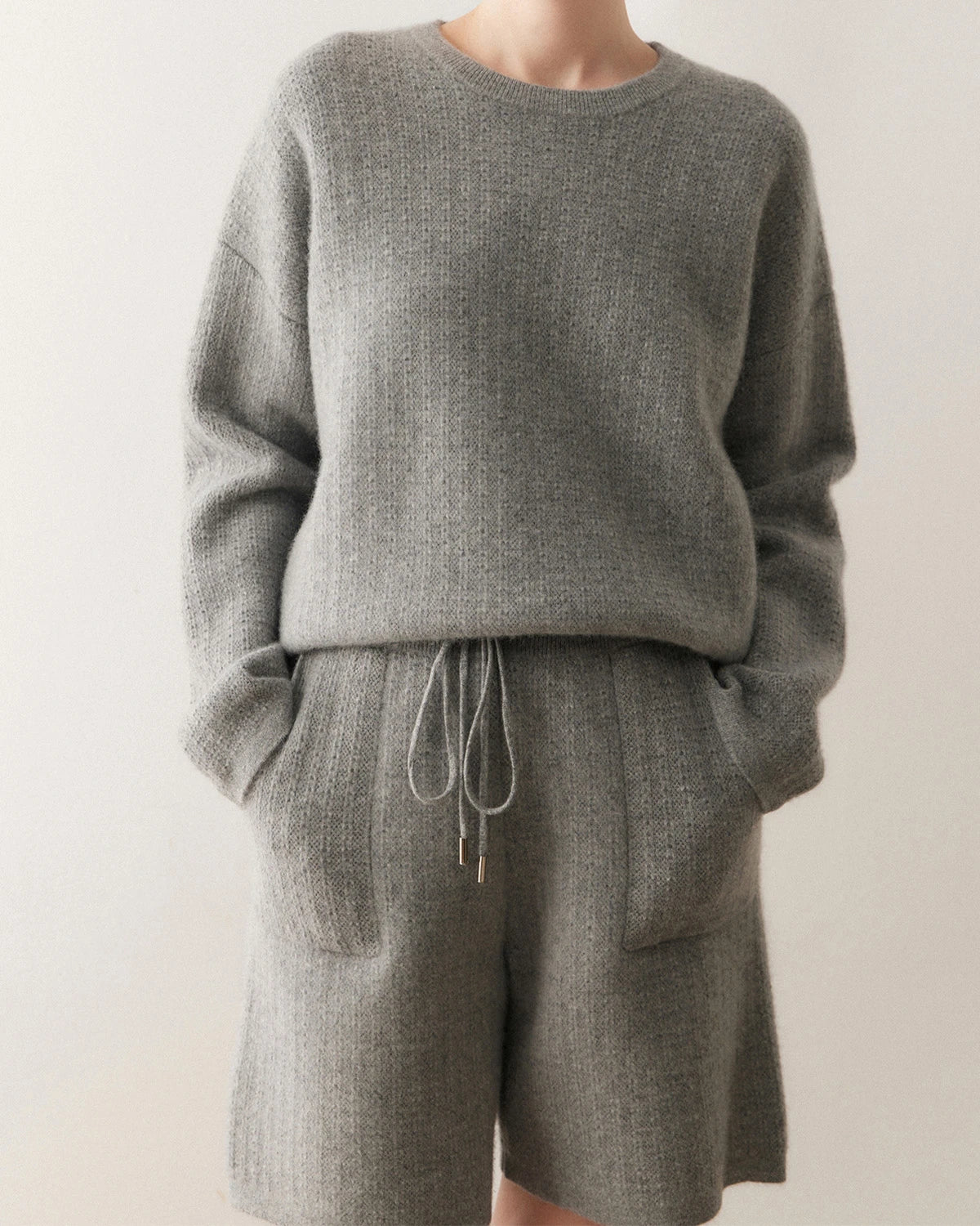 This cashmere sweater set features a relaxed dropped-shoulder pullover and wide-leg knit shorts for effortless comfort and versatility. The loose-fit top adds a modern, laid-back silhouette, while the drawstring waist on the shorts ensures a personalized fit. The subtle texture of the woolen shorts balances casual charm with refined craftsmanship. Whether you choose classic neutrals or white knit shorts, this set embodies easy elegance and timeless appeal—perfect as a cashmere set for women or a cozy knit shorts outfit for daily wear.